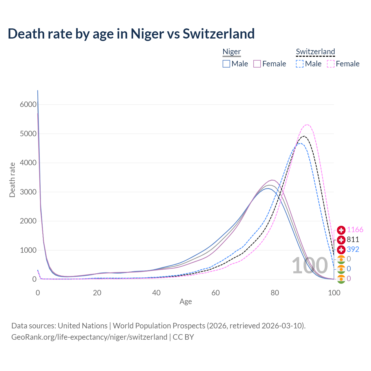In Niger, the most common age of death is 0, compared to 90 in Switzerland. The median age of death is 71.7 in Niger and 87.2 in Switzerland, meaning only half of each cohort is expected to live past that age.