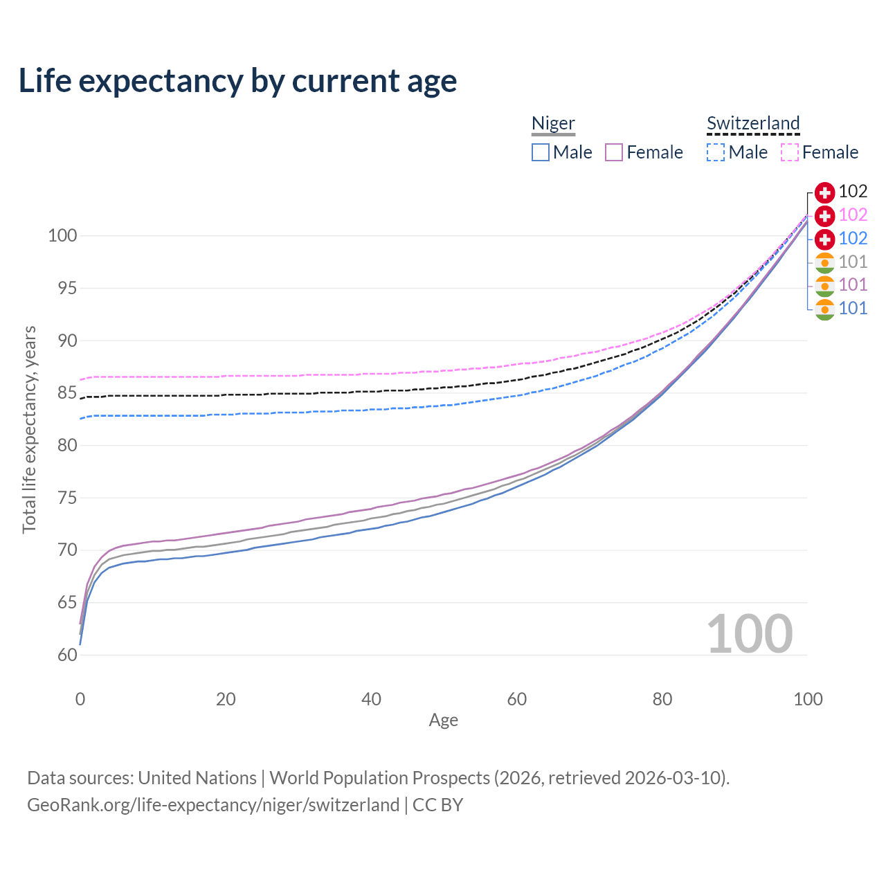 This life expectancy calculator shows the odds of living to 100, 95, 90, and below based on current age for both males and females in Niger and Switzerland, along with mean and median age of death. The calculations are based on the 2026 life tables (actuarial tables) from the UN World Population Prospects.