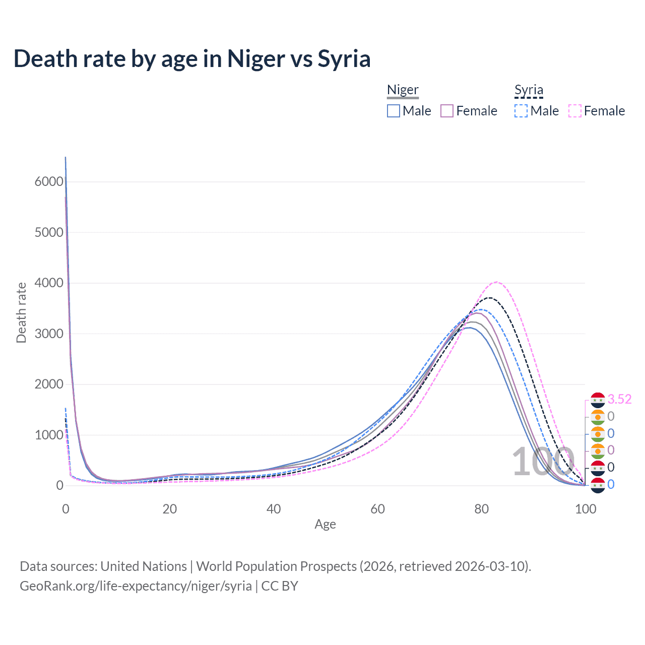 In Niger, the most common age of death is 0, compared to 82 in Syria. The median age of death is 71.7 in Niger and 77.7 in Syria, meaning only half of each cohort is expected to live past that age.