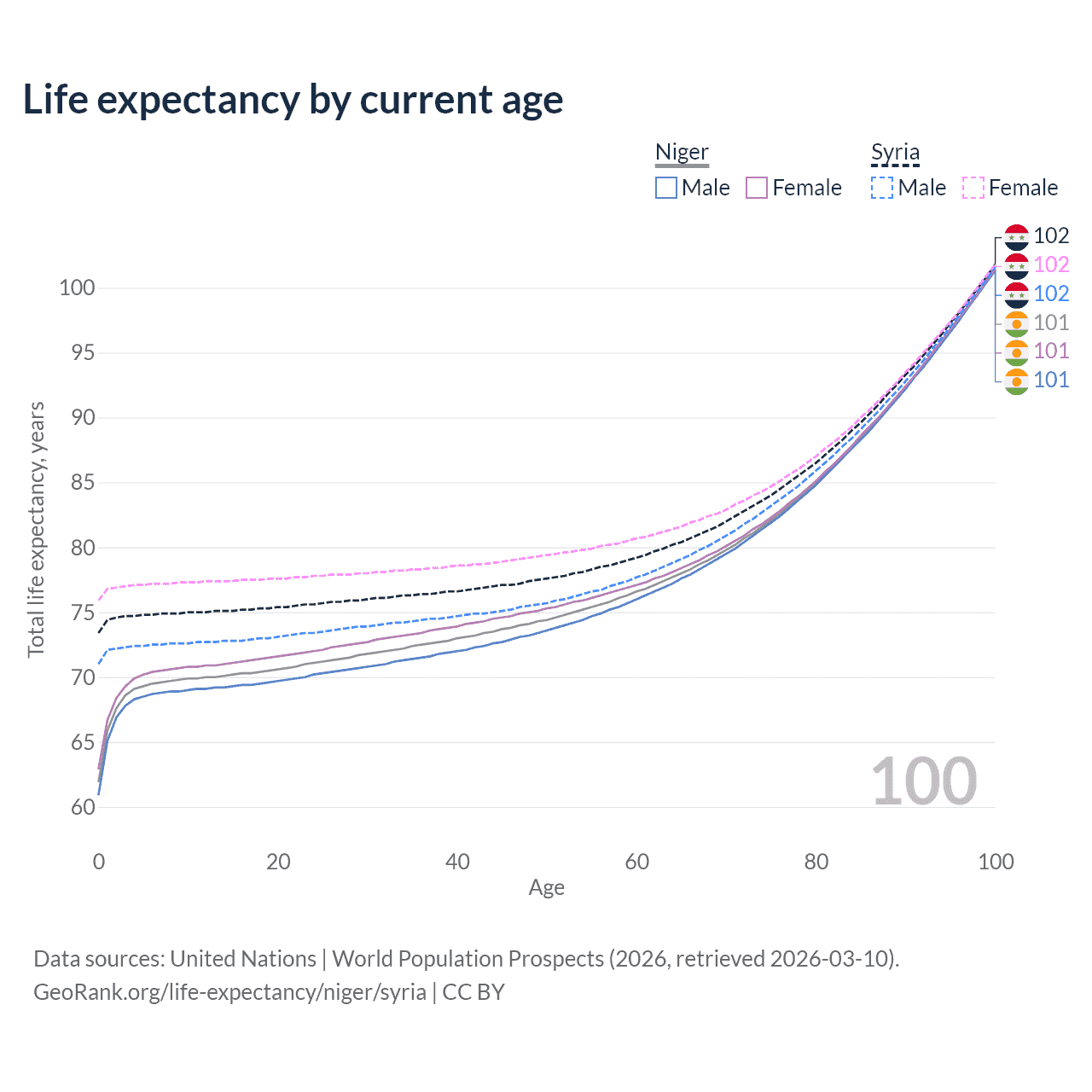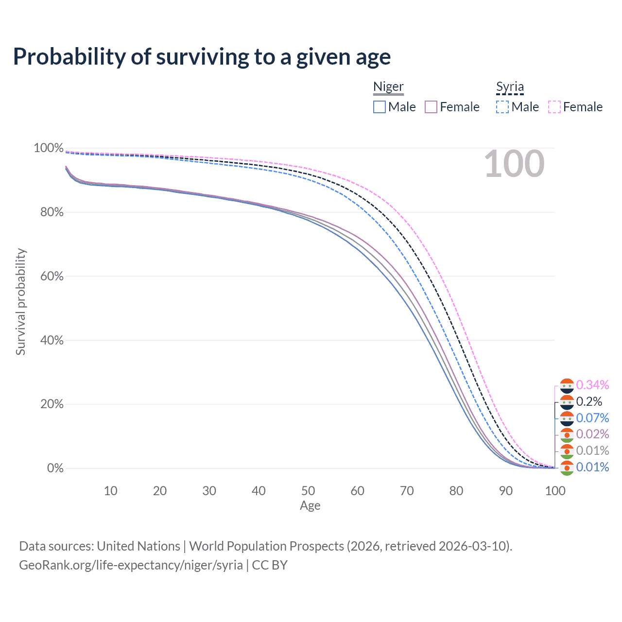 This life expectancy calculator shows the odds of living to 100, 95, 90, and below based on current age for both males and females in Niger and Syria, along with mean and median age of death. The calculations are based on the 2026 life tables (actuarial tables) from the UN World Population Prospects.