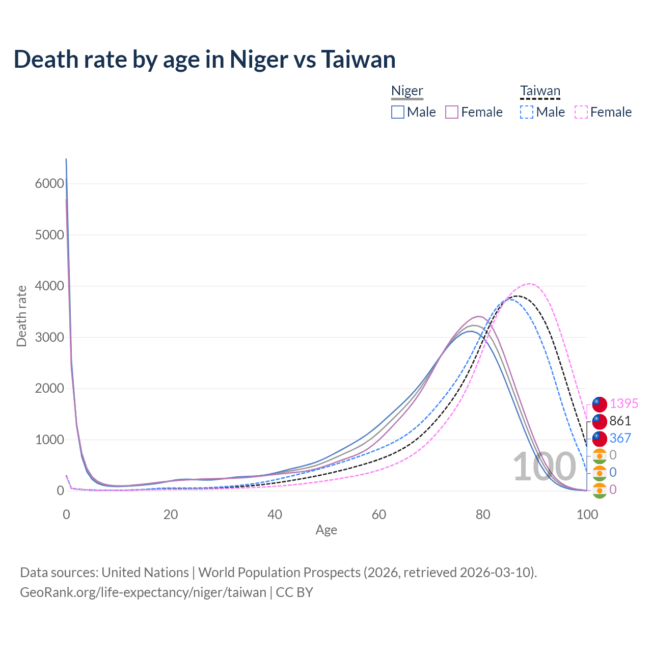 This life expectancy calculator shows the odds of living to 100, 95, 90, and below based on current age for both males and females in Niger and Taiwan, along with mean and median age of death. The calculations are based on the 2026 life tables (actuarial tables) from the UN World Population Prospects.