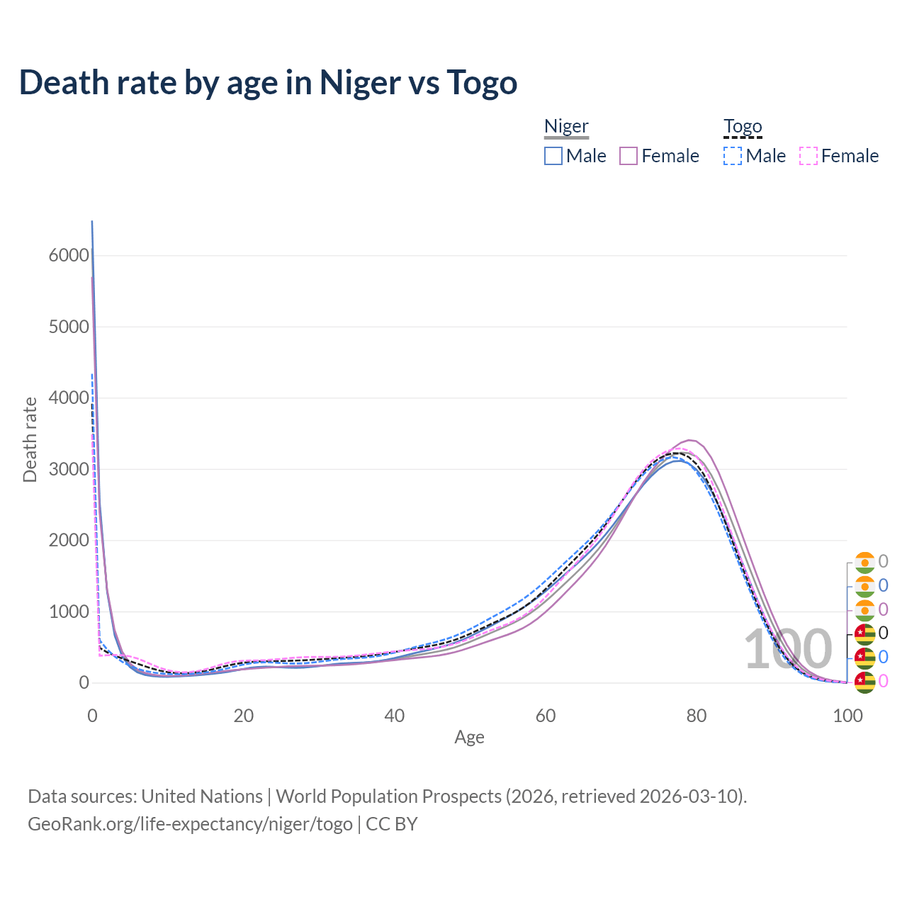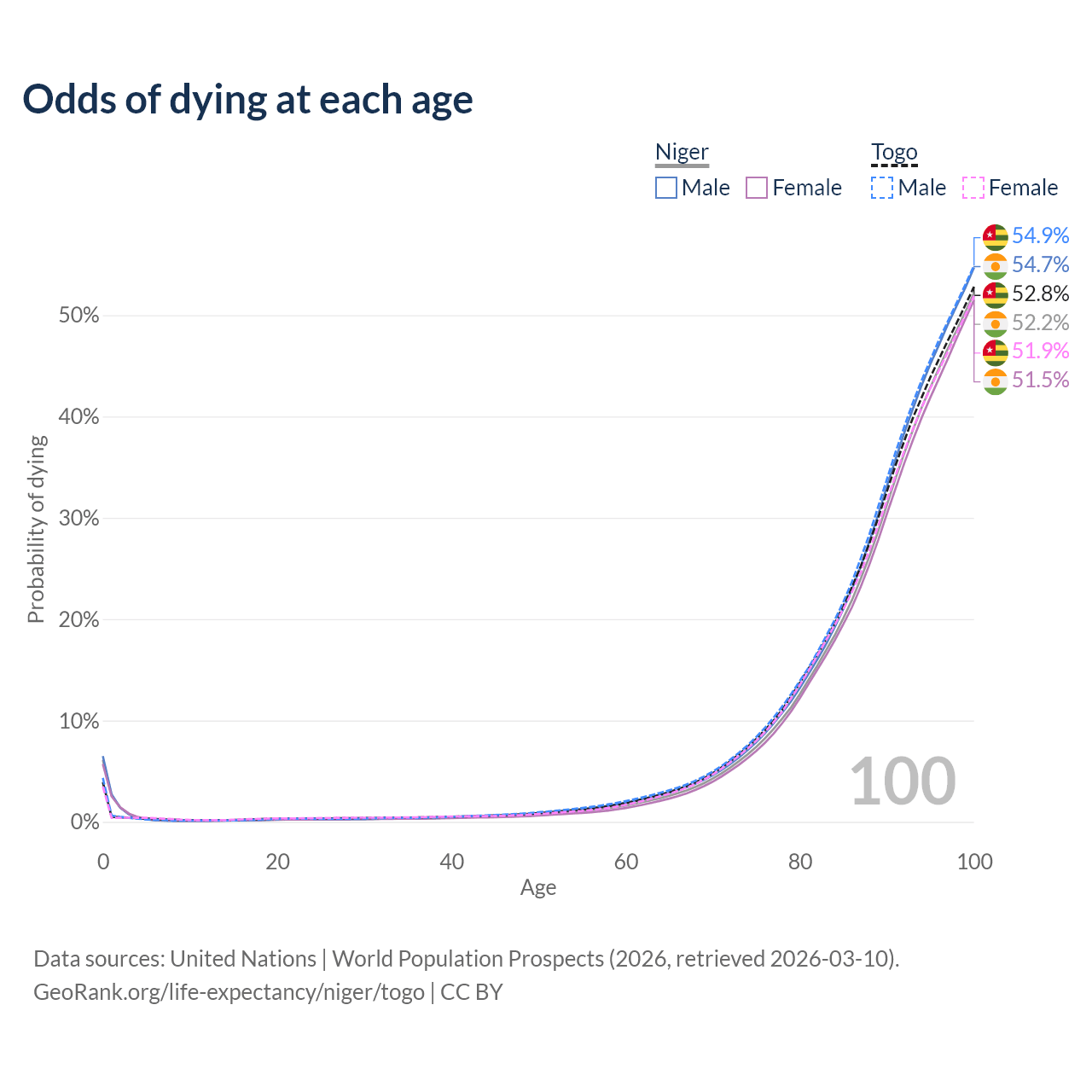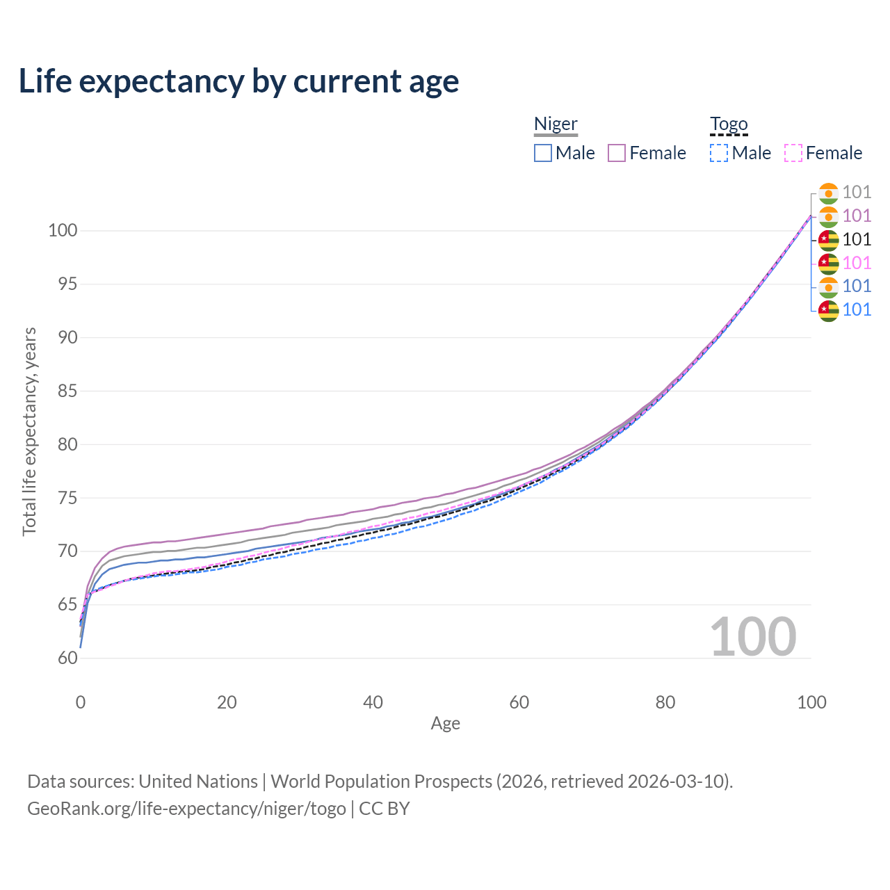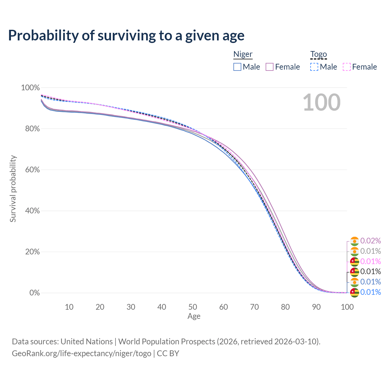 This life expectancy calculator shows the odds of living to 100, 95, 90, and below based on current age for both males and females in Niger and Togo, along with mean and median age of death. The calculations are based on the 2026 life tables (actuarial tables) from the UN World Population Prospects.