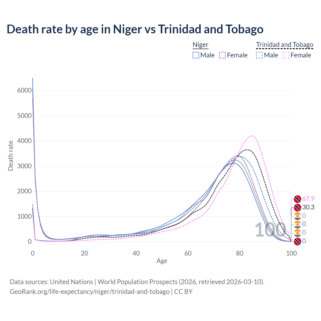 In Niger, the most common age of death is 0, compared to 83 in Trinidad and Tobago. The median age of death is 71.7 in Niger and 78.4 in Trinidad and Tobago, meaning only half of each cohort is expected to live past that age.