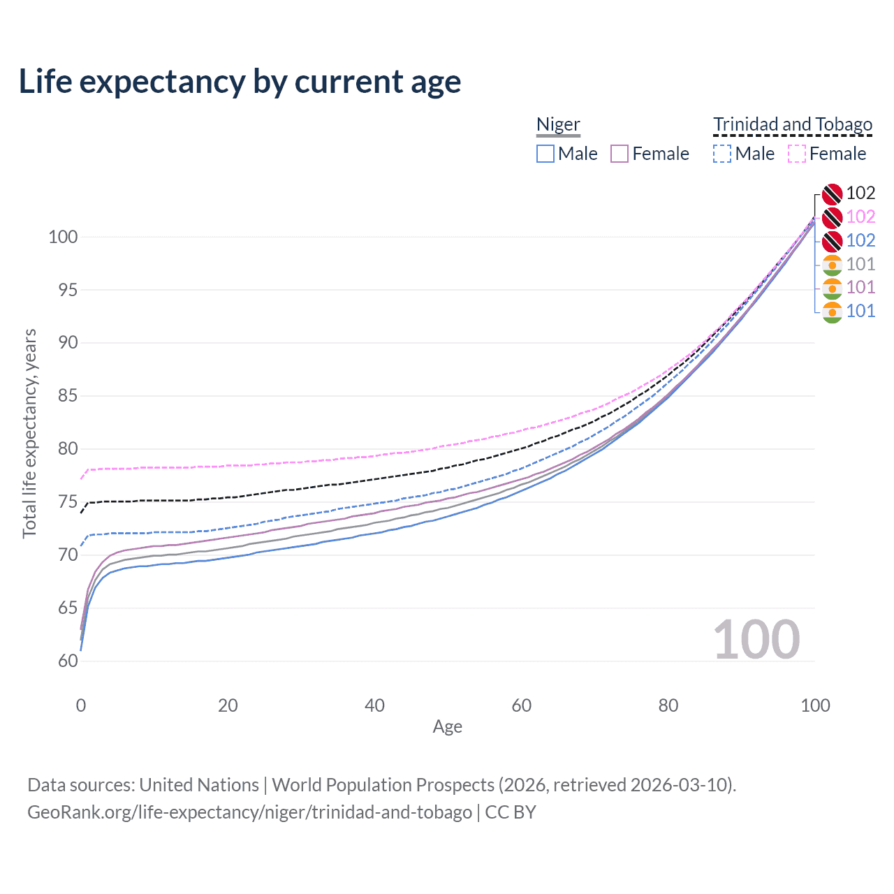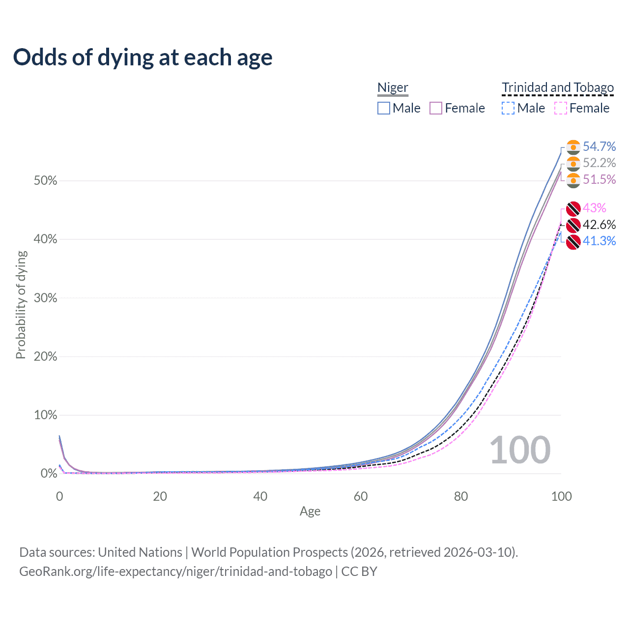 This life expectancy calculator shows the odds of living to 100, 95, 90, and below based on current age for both males and females in Niger and Trinidad and Tobago, along with mean and median age of death. The calculations are based on the 2026 life tables (actuarial tables) from the UN World Population Prospects.