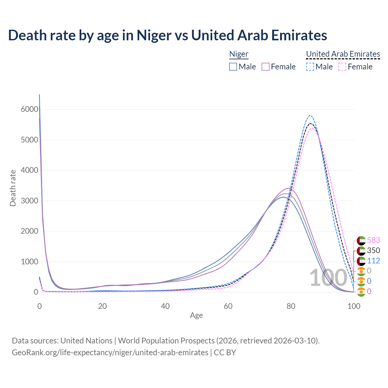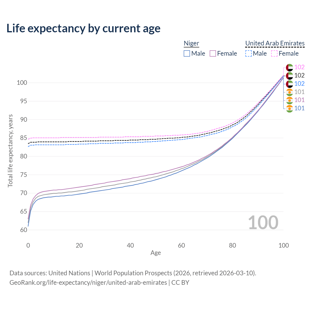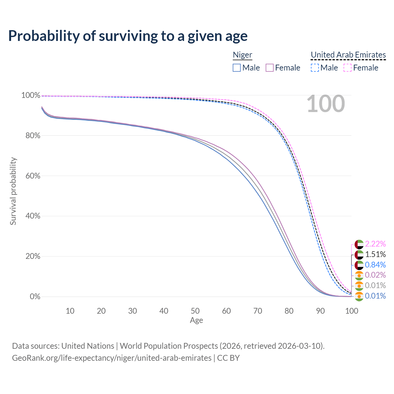 This life expectancy calculator shows the odds of living to 100, 95, 90, and below based on current age for both males and females in Niger and the United Arab Emirates, along with mean and median age of death. The calculations are based on the 2026 life tables (actuarial tables) from the UN World Population Prospects.