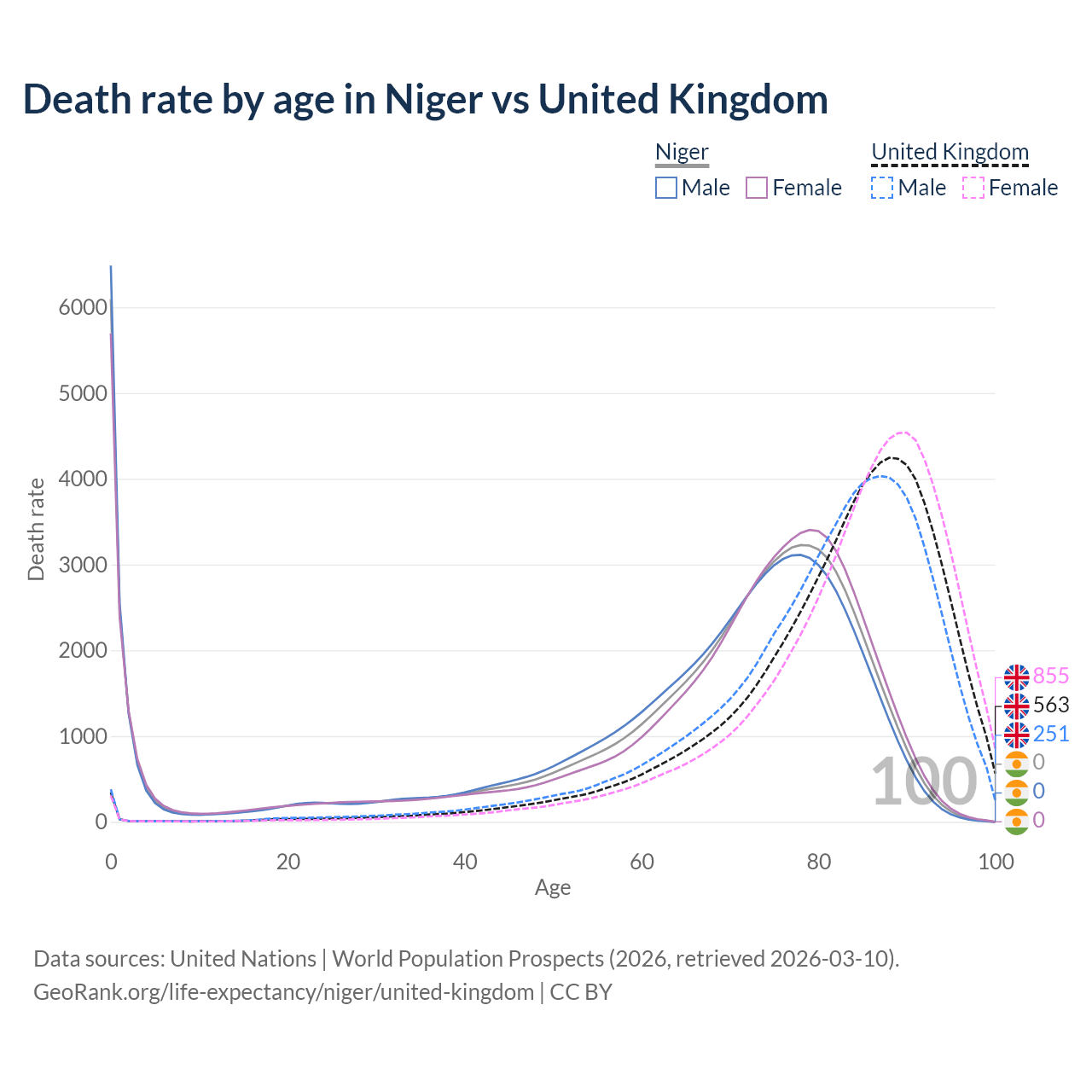 In Niger, the most common age of death is 0, compared to 88 in the United Kingdom. The median age of death is 71.7 in Niger and 84.9 in the United Kingdom, meaning only half of each cohort is expected to live past that age.