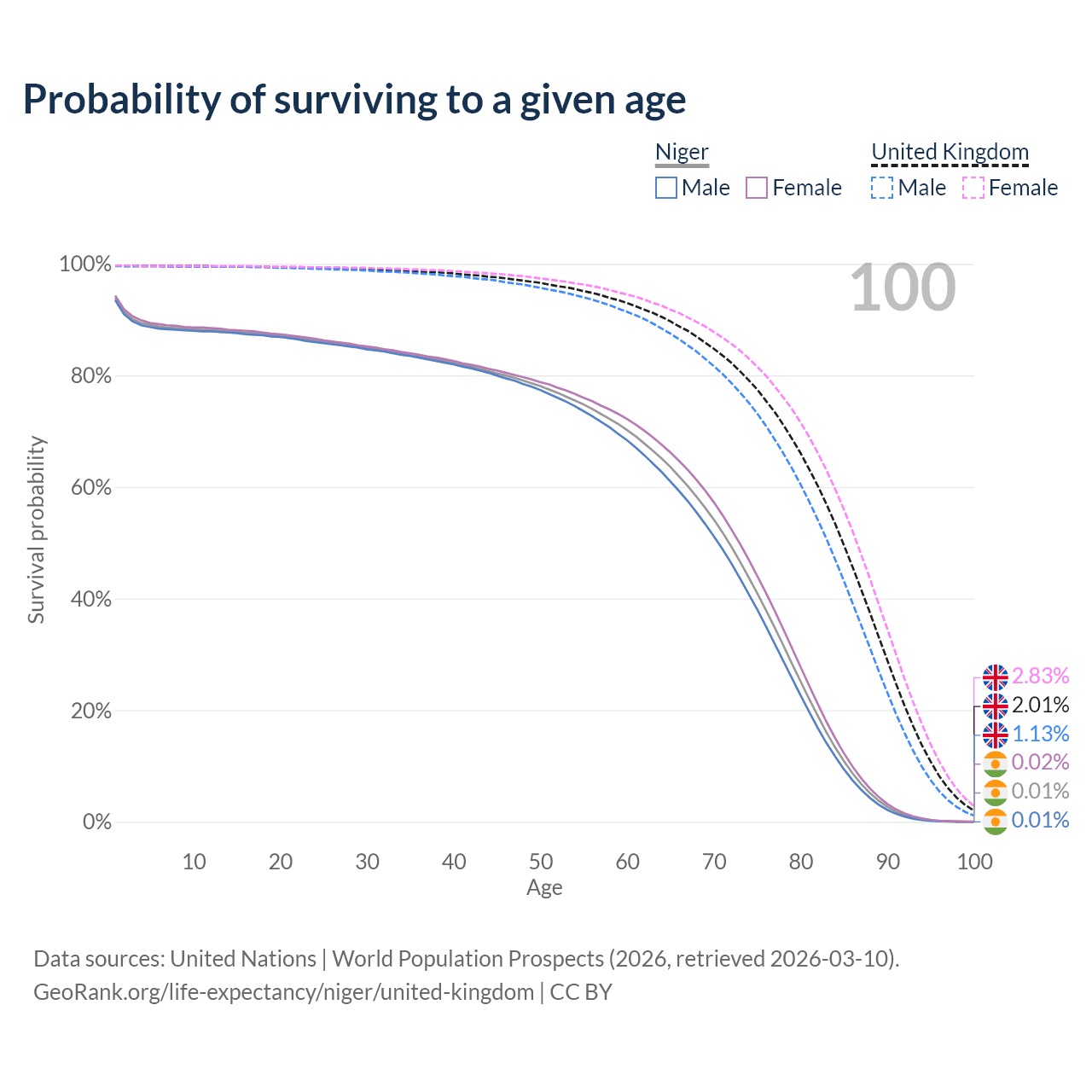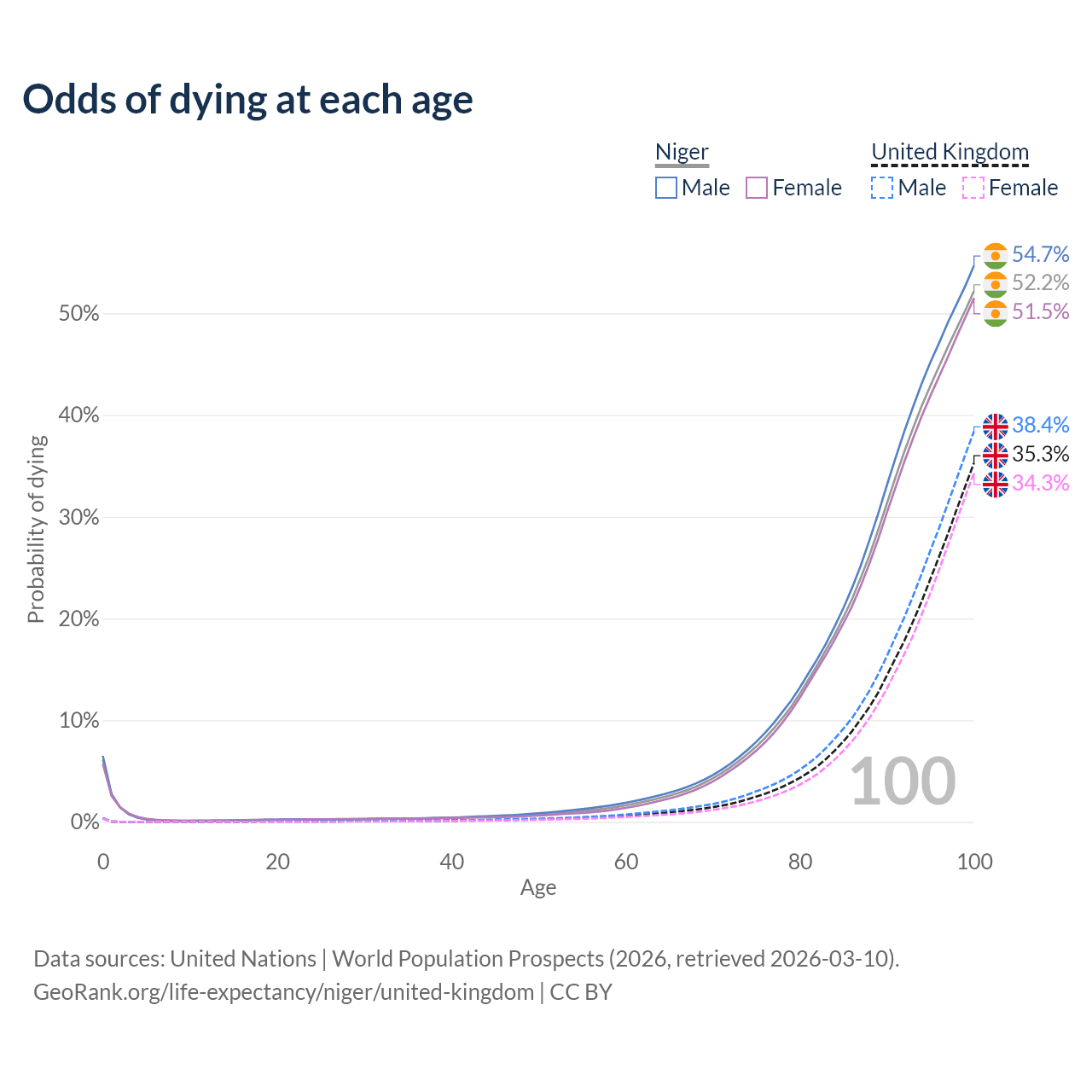 This life expectancy calculator shows the odds of living to 100, 95, 90, and below based on current age for both males and females in Niger and the United Kingdom, along with mean and median age of death. The calculations are based on the 2026 life tables (actuarial tables) from the UN World Population Prospects.