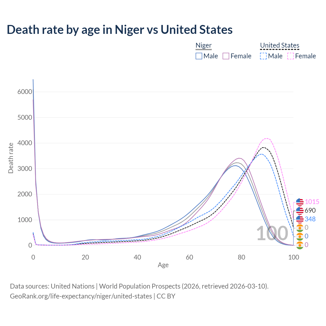 In Niger, the most common age of death is 0, compared to 89 in the United States. The median age of death is 71.7 in Niger and 83.9 in the United States, meaning only half of each cohort is expected to live past that age.