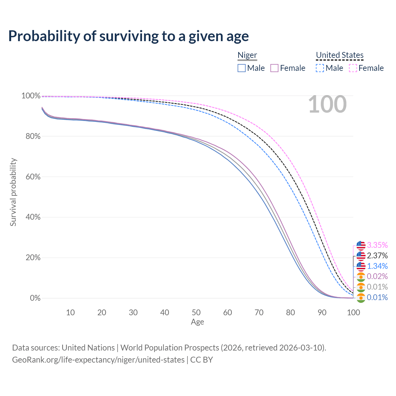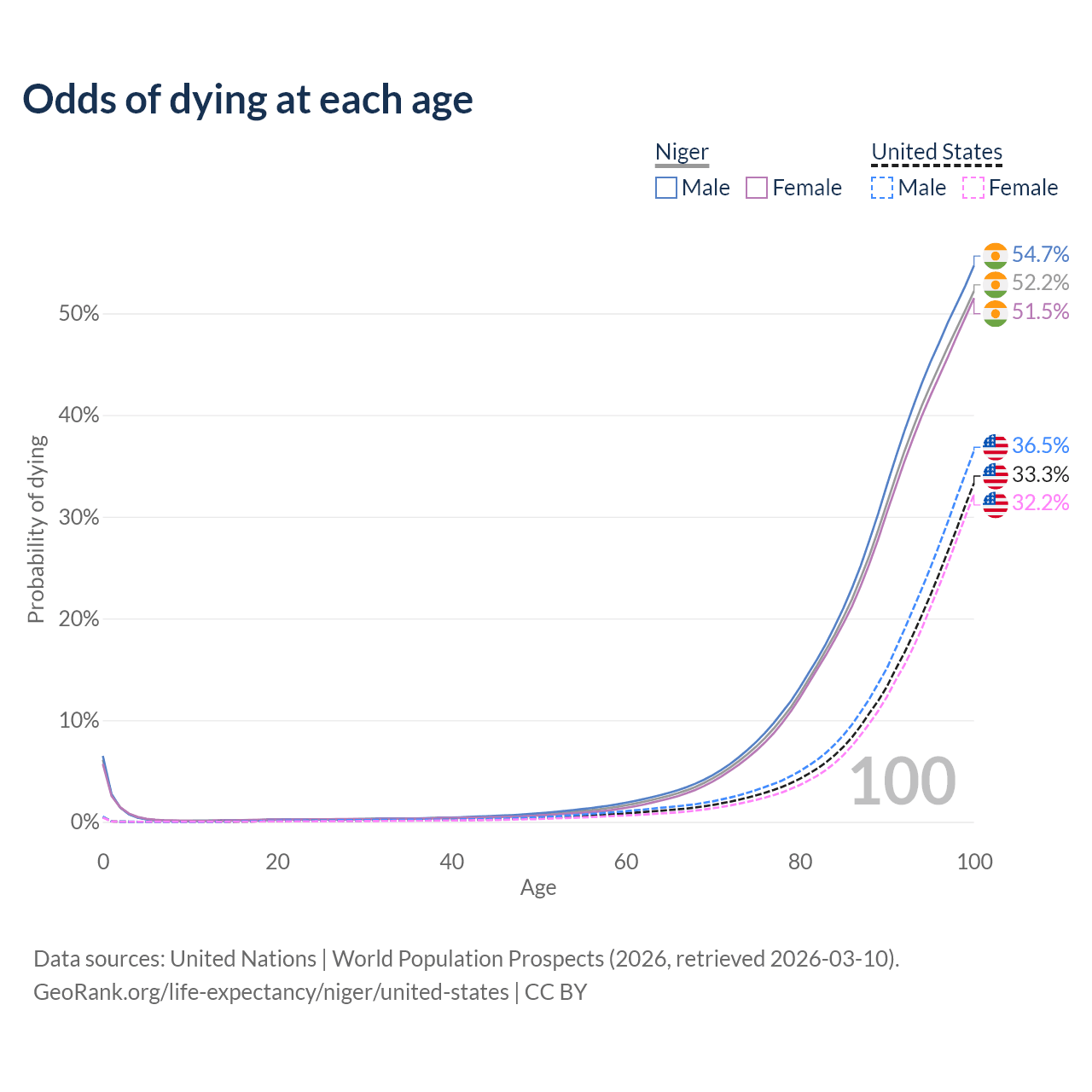 This life expectancy calculator shows the odds of living to 100, 95, 90, and below based on current age for both males and females in Niger and the United States, along with mean and median age of death. The calculations are based on the 2026 life tables (actuarial tables) from the UN World Population Prospects.
