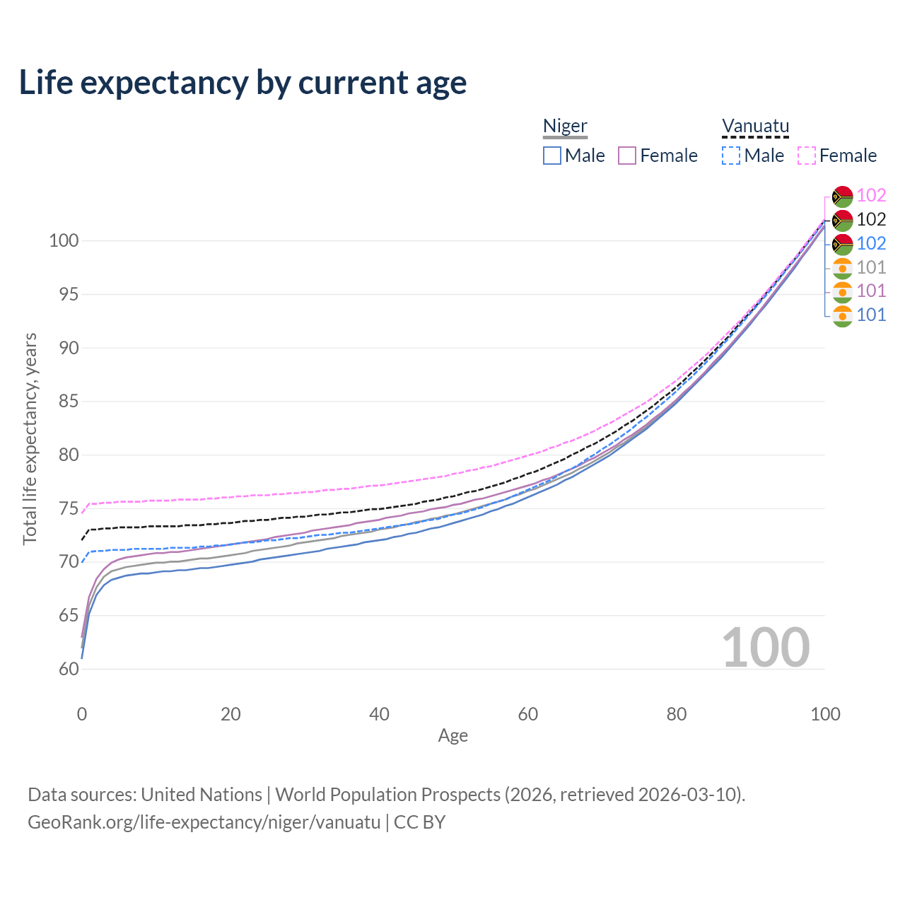 This life expectancy calculator shows the odds of living to 100, 95, 90, and below based on current age for both males and females in Niger and Vanuatu, along with mean and median age of death. The calculations are based on the 2026 life tables (actuarial tables) from the UN World Population Prospects.