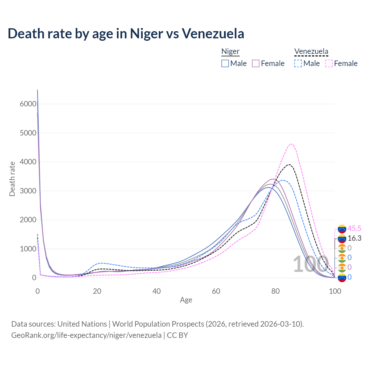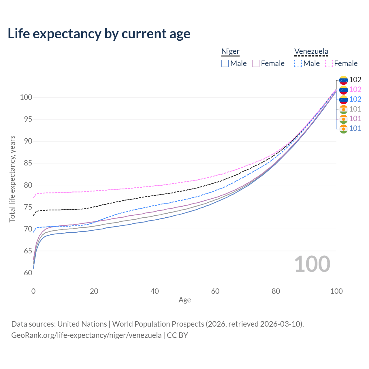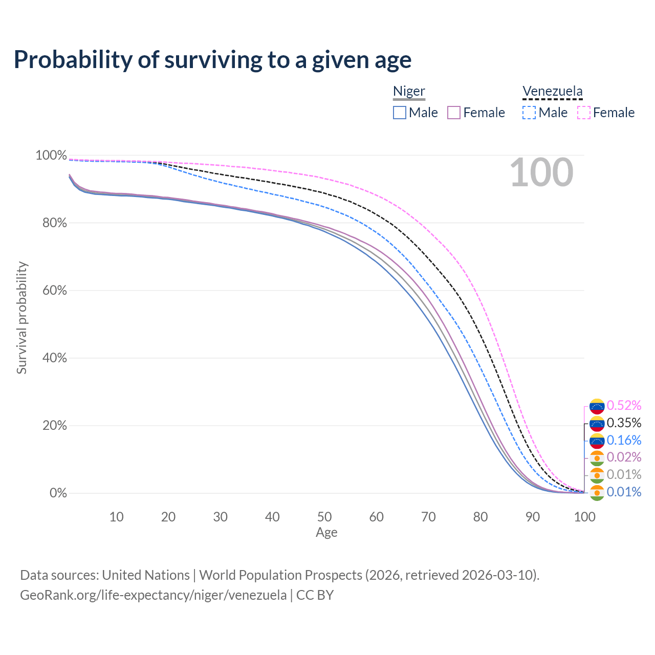 This life expectancy calculator shows the odds of living to 100, 95, 90, and below based on current age for both males and females in Niger and Venezuela, along with mean and median age of death. The calculations are based on the 2026 life tables (actuarial tables) from the UN World Population Prospects.