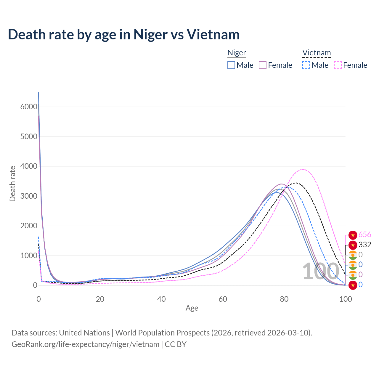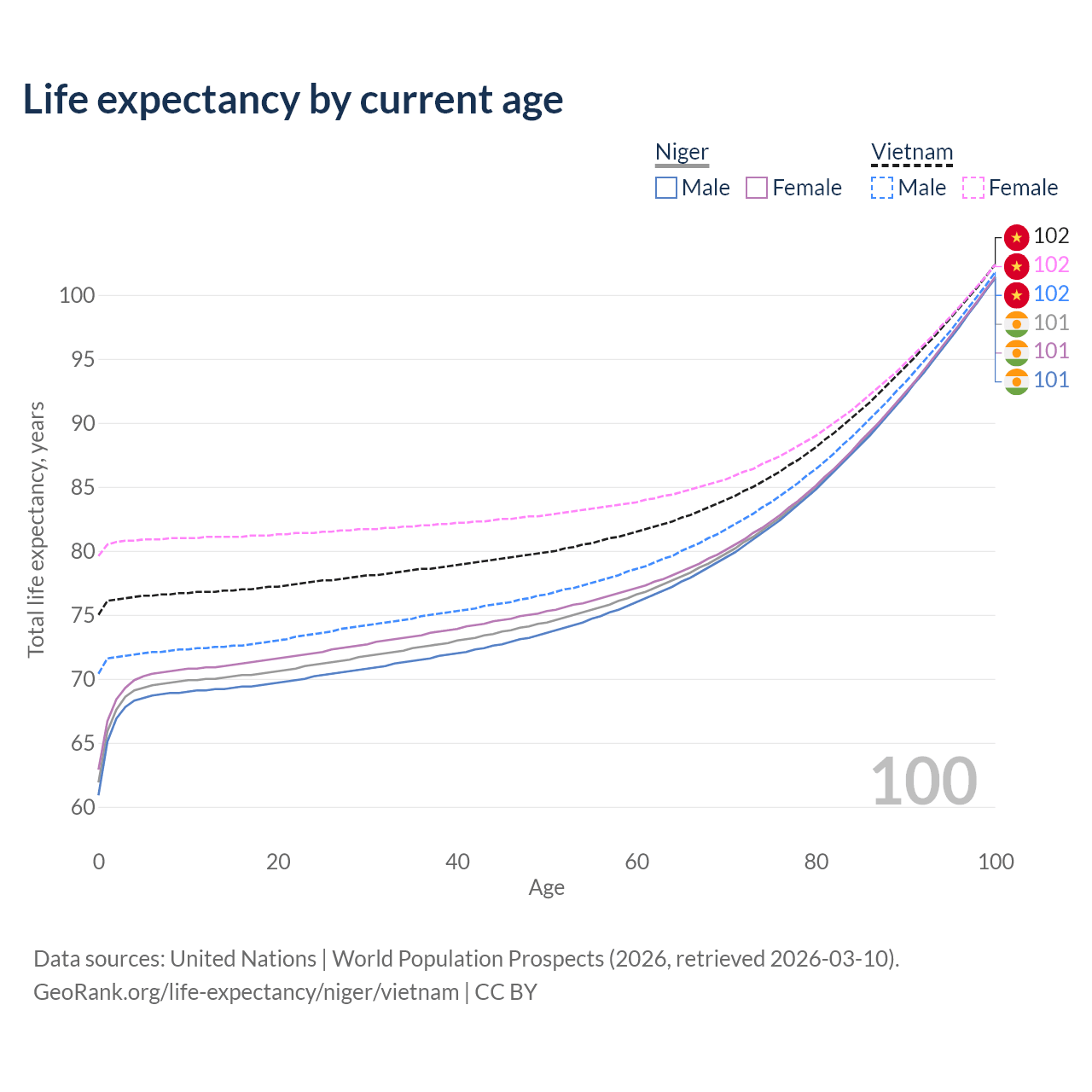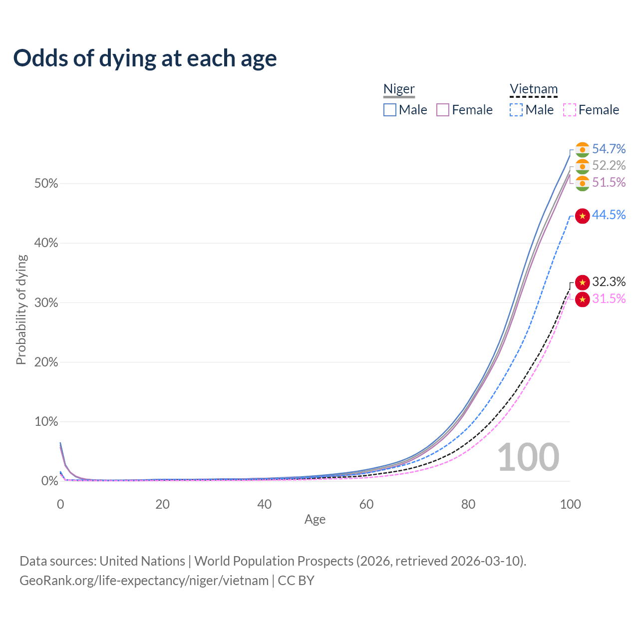 This life expectancy calculator shows the odds of living to 100, 95, 90, and below based on current age for both males and females in Niger and Vietnam, along with mean and median age of death. The calculations are based on the 2026 life tables (actuarial tables) from the UN World Population Prospects.