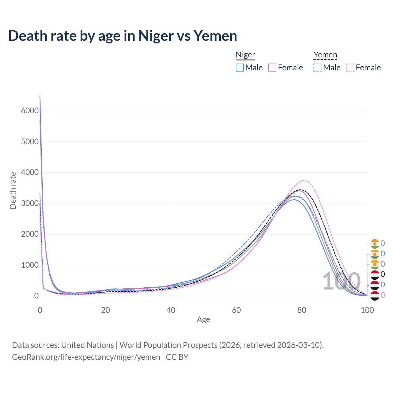 In Niger, the most common age of death is 0, compared to 80 in Yemen. The median age of death is 71.7 in Niger and 74.9 in Yemen, meaning only half of each cohort is expected to live past that age.