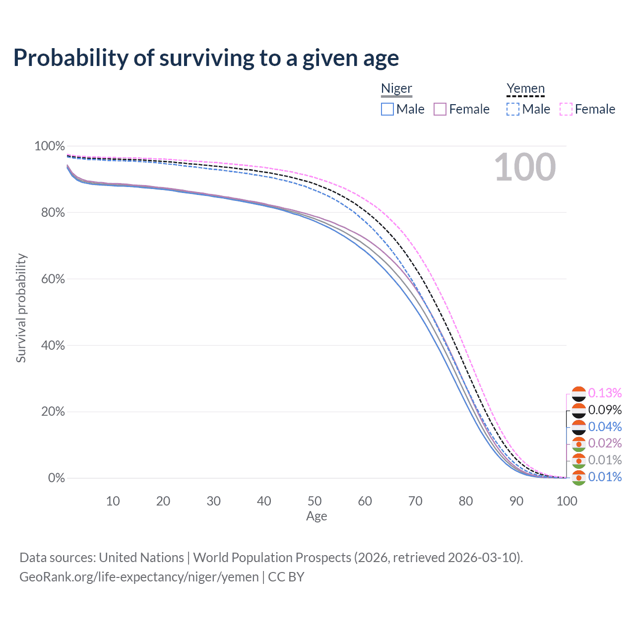 This life expectancy calculator shows the odds of living to 100, 95, 90, and below based on current age for both males and females in Niger and Yemen, along with mean and median age of death. The calculations are based on the 2026 life tables (actuarial tables) from the UN World Population Prospects.