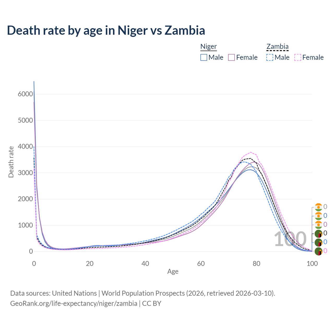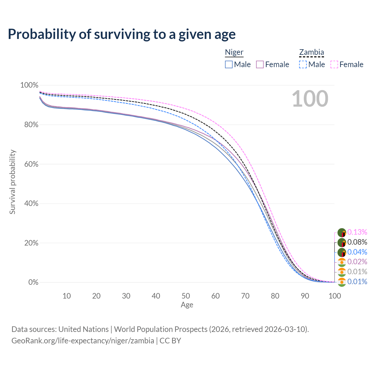This life expectancy calculator shows the odds of living to 100, 95, 90, and below based on current age for both males and females in Niger and Zambia, along with mean and median age of death. The calculations are based on the 2026 life tables (actuarial tables) from the UN World Population Prospects.