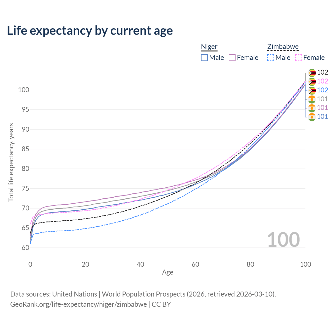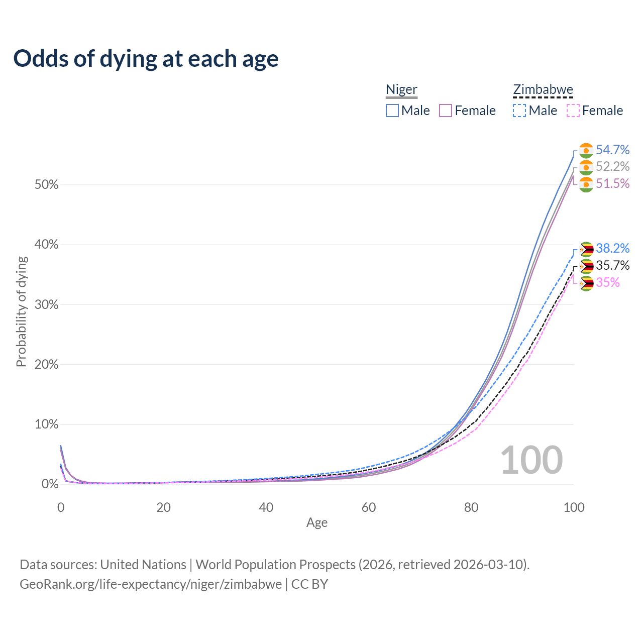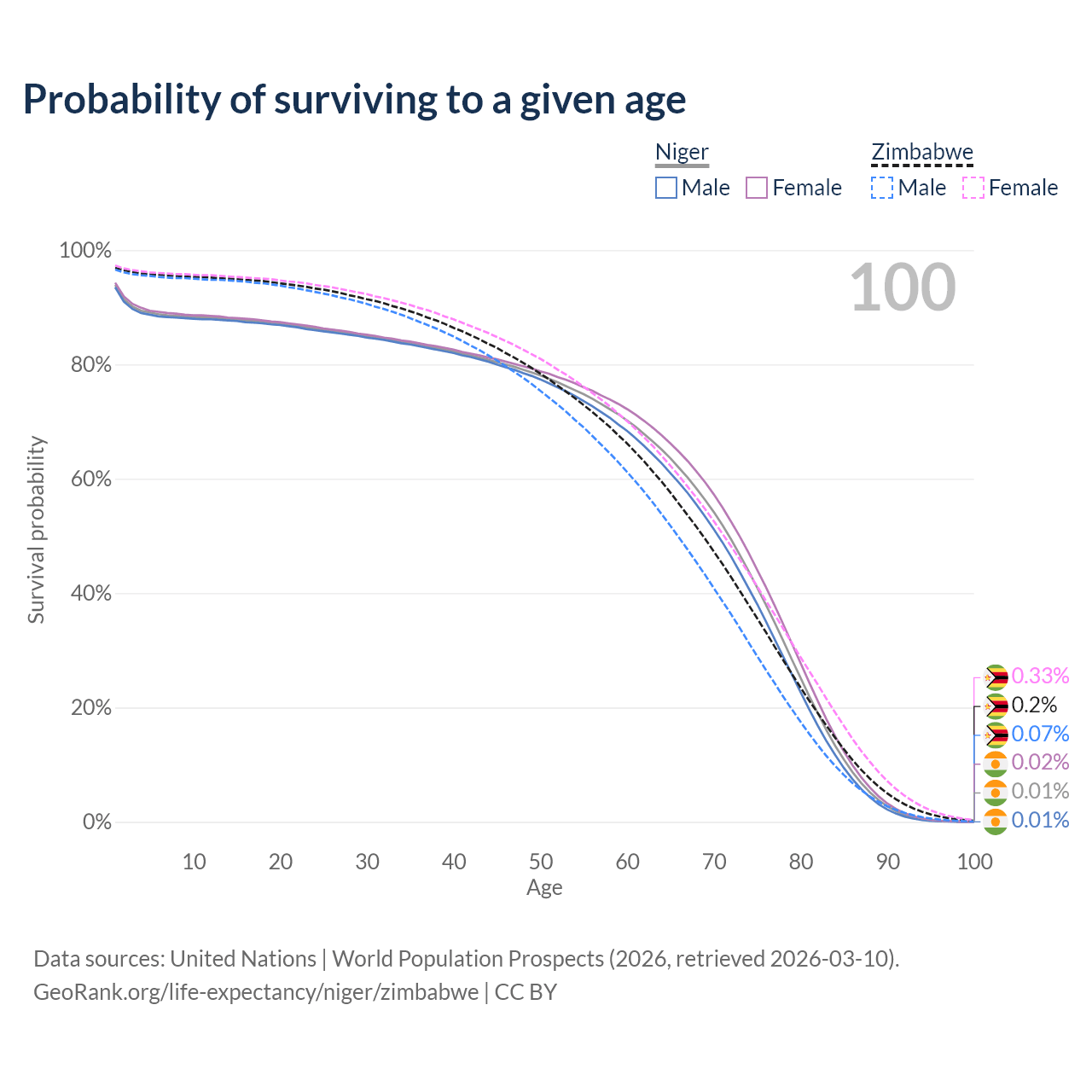 This life expectancy calculator shows the odds of living to 100, 95, 90, and below based on current age for both males and females in Niger and Zimbabwe, along with mean and median age of death. The calculations are based on the 2026 life tables (actuarial tables) from the UN World Population Prospects.