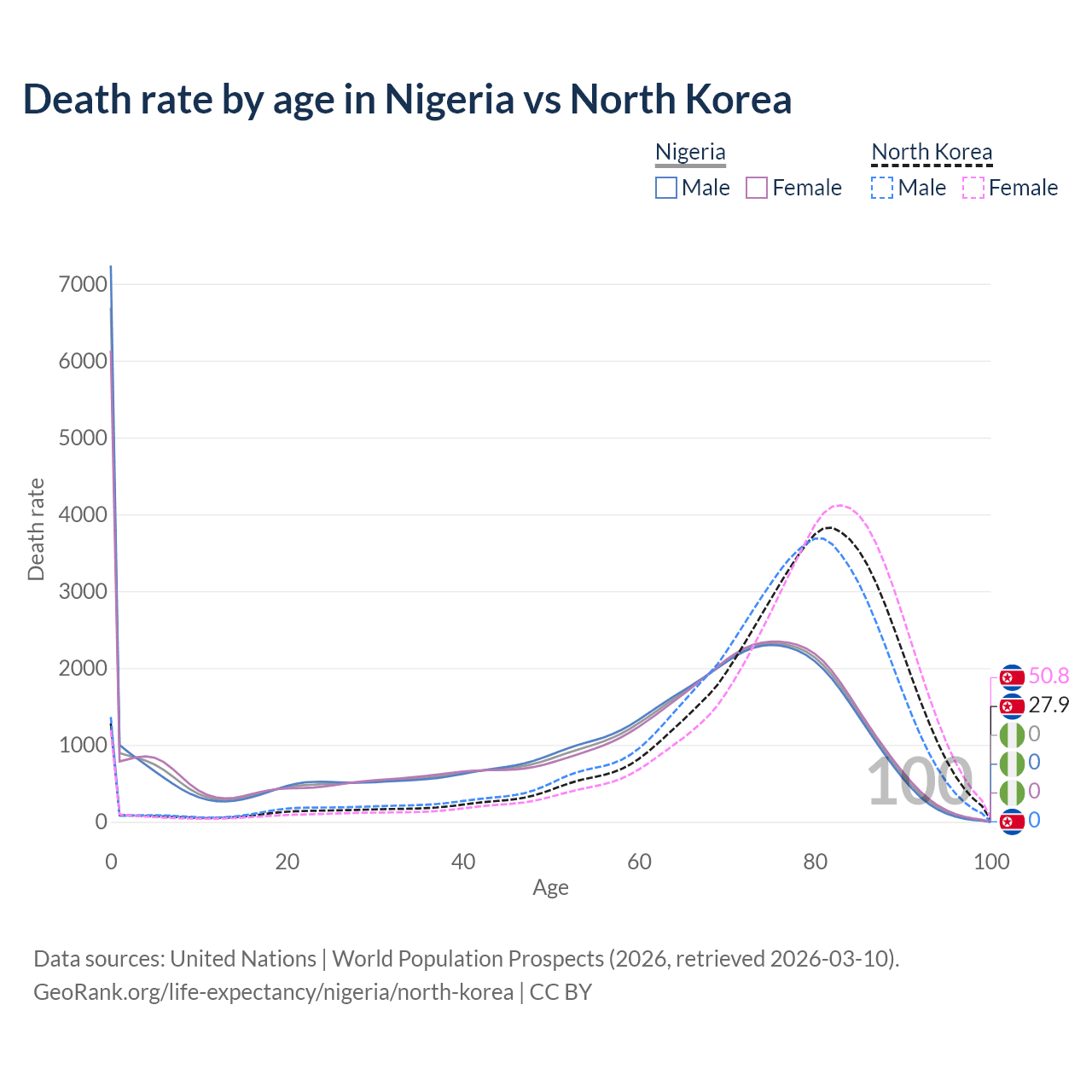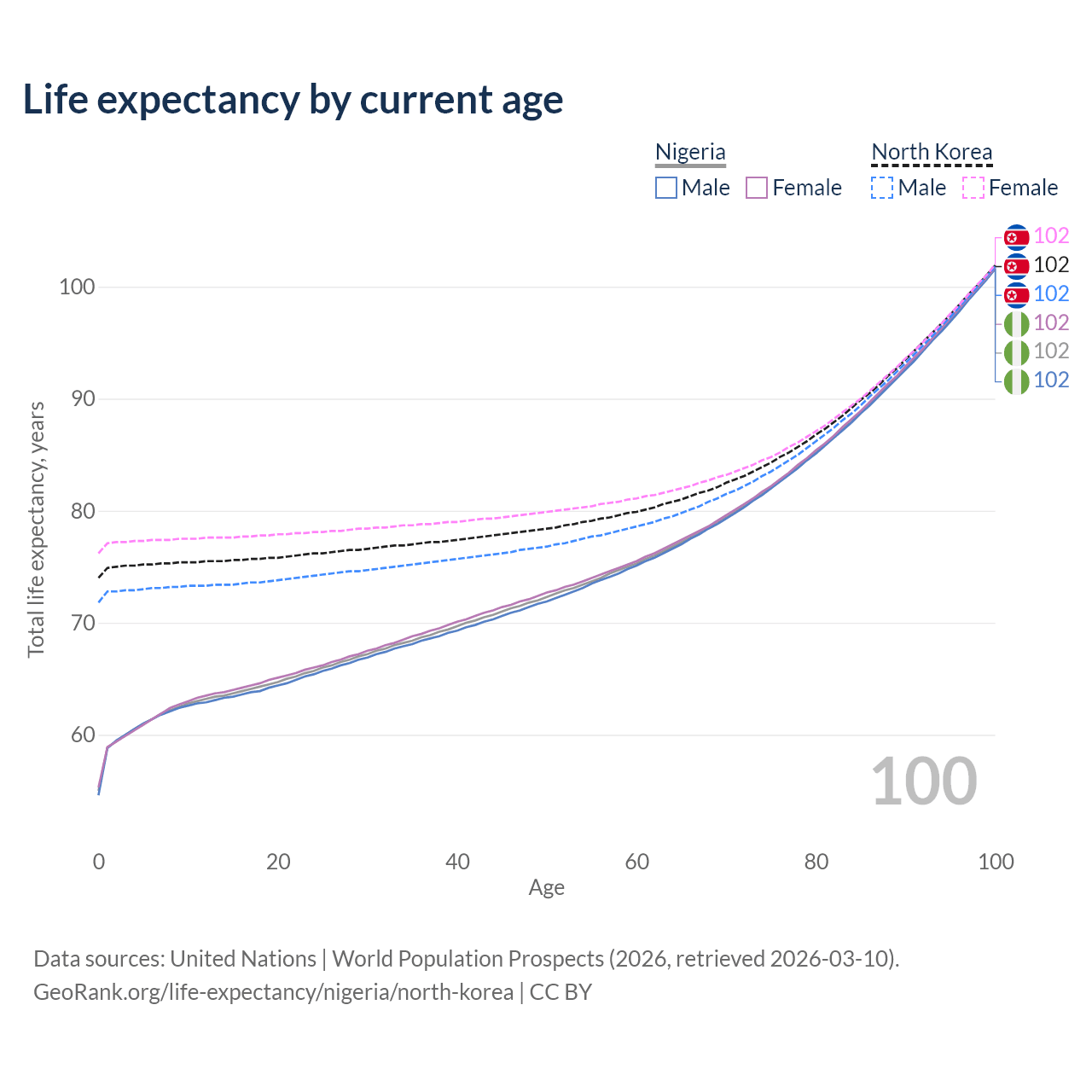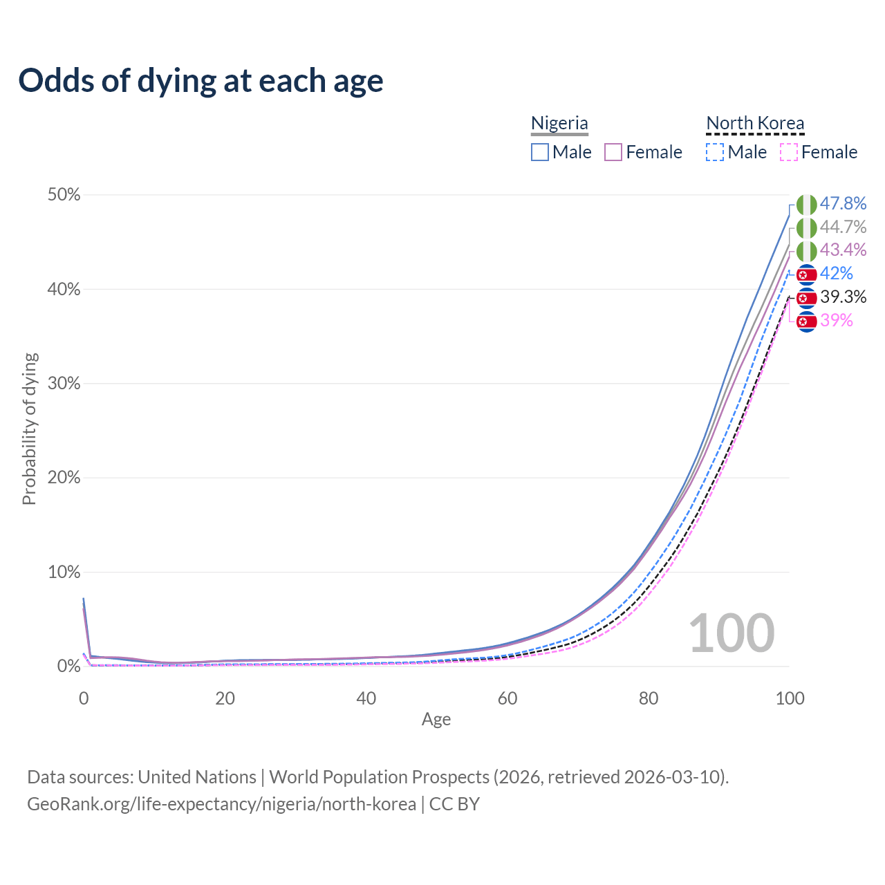 This life expectancy calculator shows the odds of living to 100, 95, 90, and below based on current age for both males and females in Nigeria and North Korea, along with mean and median age of death. The calculations are based on the 2026 life tables (actuarial tables) from the UN World Population Prospects.