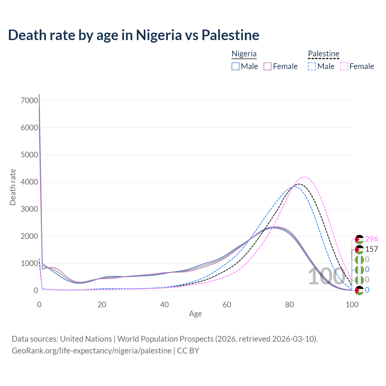 In Nigeria, the most common age of death is 0, compared to 83 in Palestine. The median age of death is 64.3 in Nigeria and 80.5 in Palestine, meaning only half of each cohort is expected to live past that age.