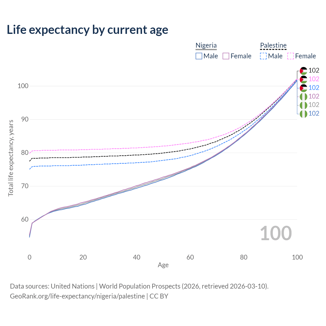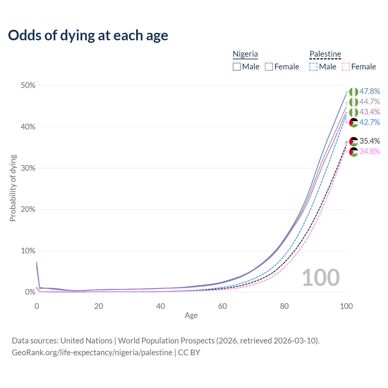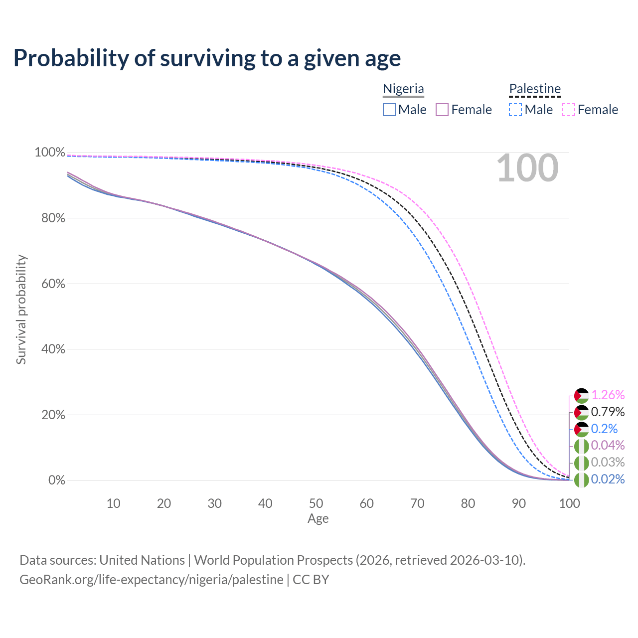 This life expectancy calculator shows the odds of living to 100, 95, 90, and below based on current age for both males and females in Nigeria and Palestine, along with mean and median age of death. The calculations are based on the 2026 life tables (actuarial tables) from the UN World Population Prospects.