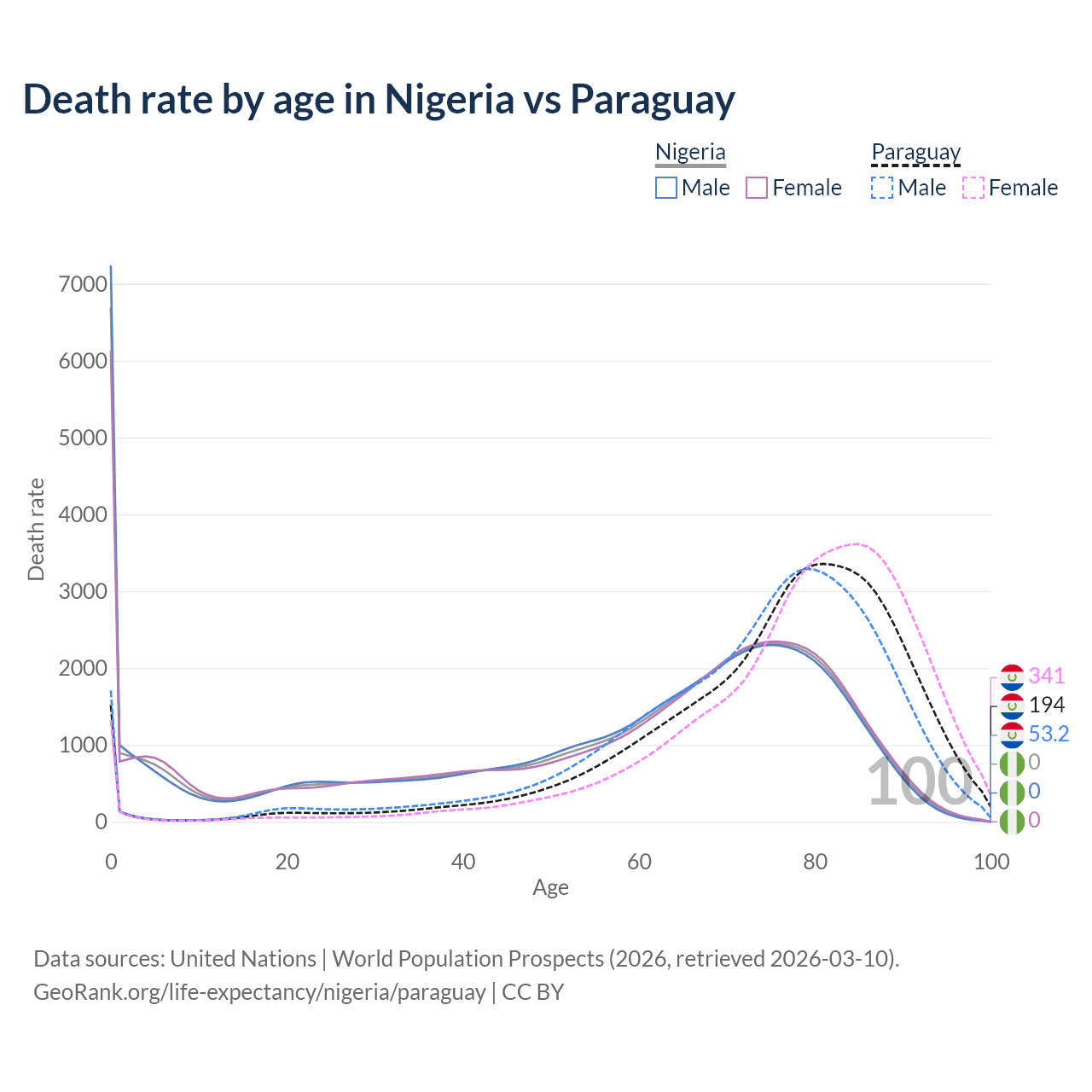 The average life expectancy at birth is 55 years in Nigeria vs 74.2 in Paraguay. Nigeria is ranked 197/197 by life expectancy, and Paraguay is 100/197. In Nigeria, the life expectancy is 54.6 years for males and 55.3 years for females. In Paraguay, it's 71.3 years for males and 77.4 years for females.
