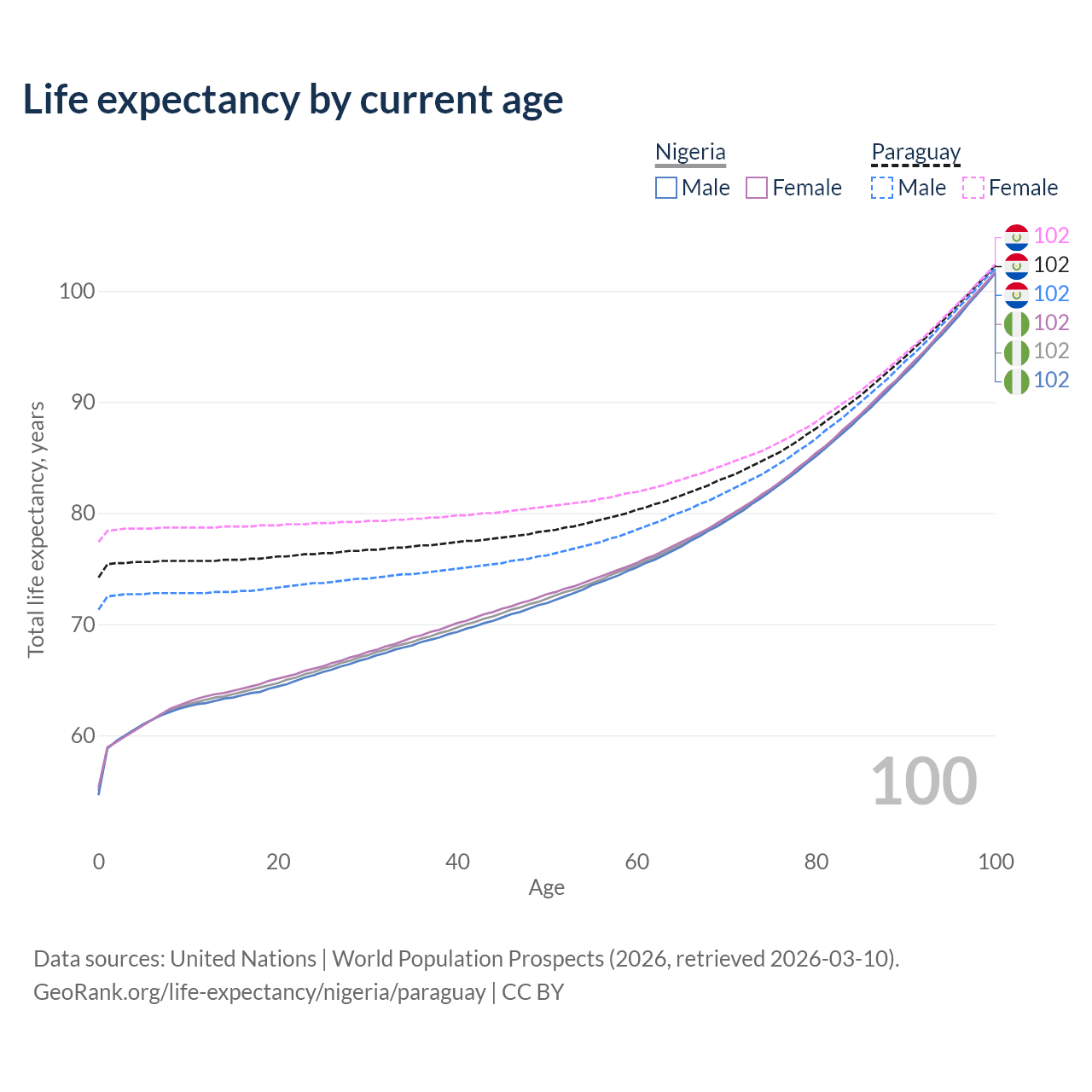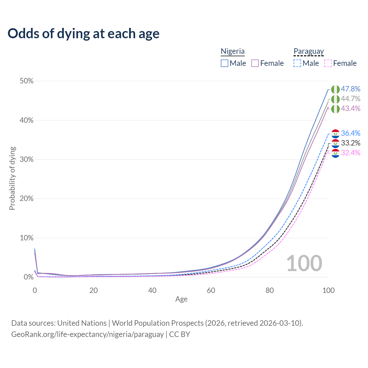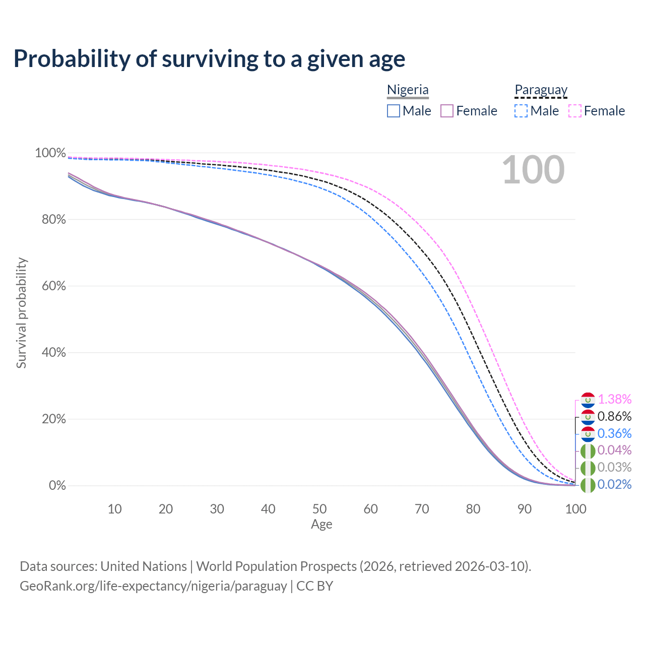 This life expectancy calculator shows the odds of living to 100, 95, 90, and below based on current age for both males and females in Nigeria and Paraguay, along with mean and median age of death. The calculations are based on the 2026 life tables (actuarial tables) from the UN World Population Prospects.