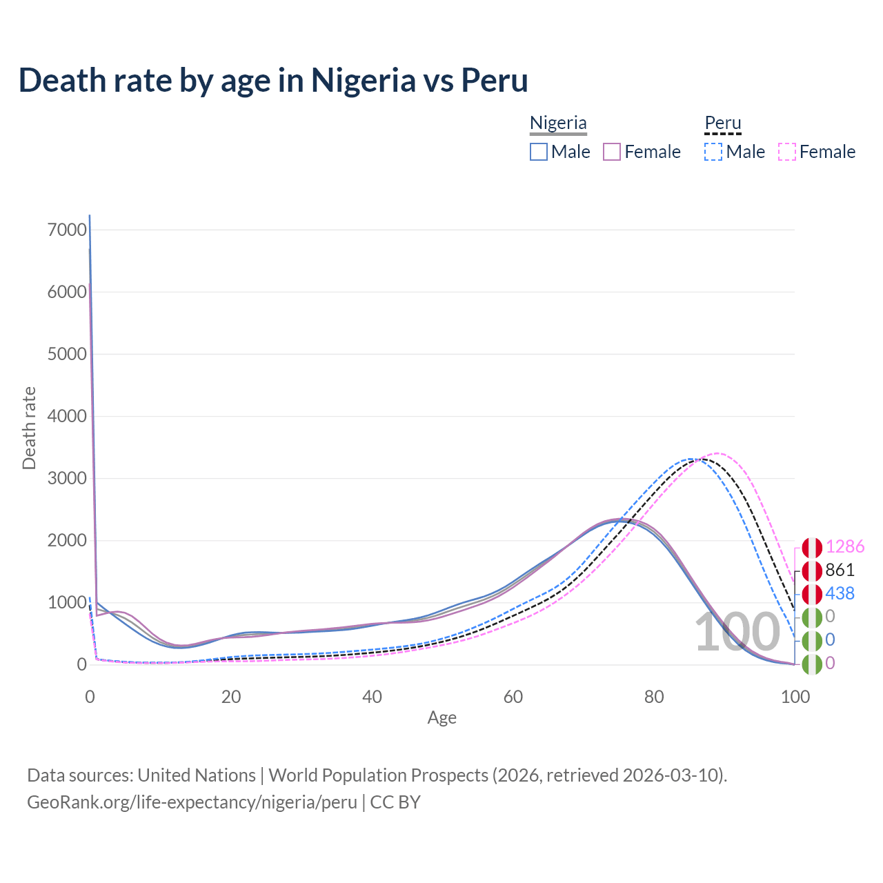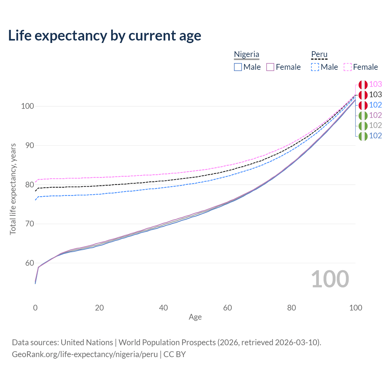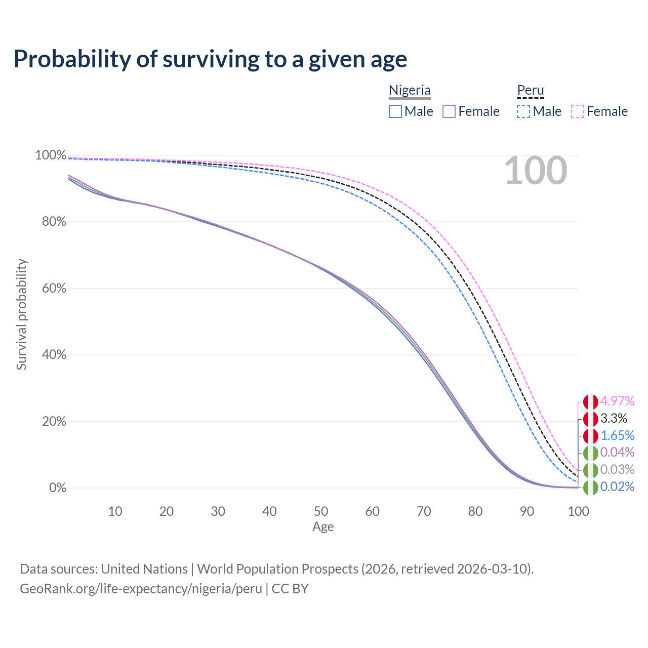 This life expectancy calculator shows the odds of living to 100, 95, 90, and below based on current age for both males and females in Nigeria and Peru, along with mean and median age of death. The calculations are based on the 2026 life tables (actuarial tables) from the UN World Population Prospects.