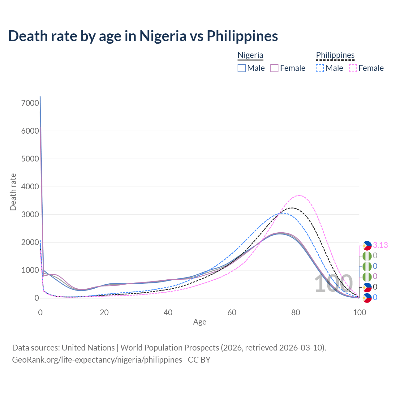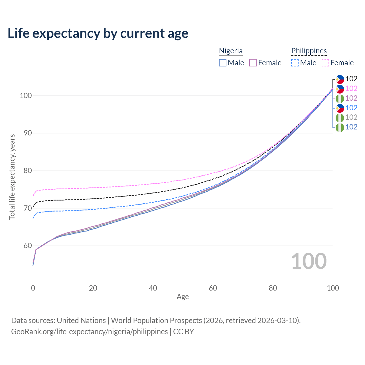 This life expectancy calculator shows the odds of living to 100, 95, 90, and below based on current age for both males and females in Nigeria and the Philippines, along with mean and median age of death. The calculations are based on the 2026 life tables (actuarial tables) from the UN World Population Prospects.
