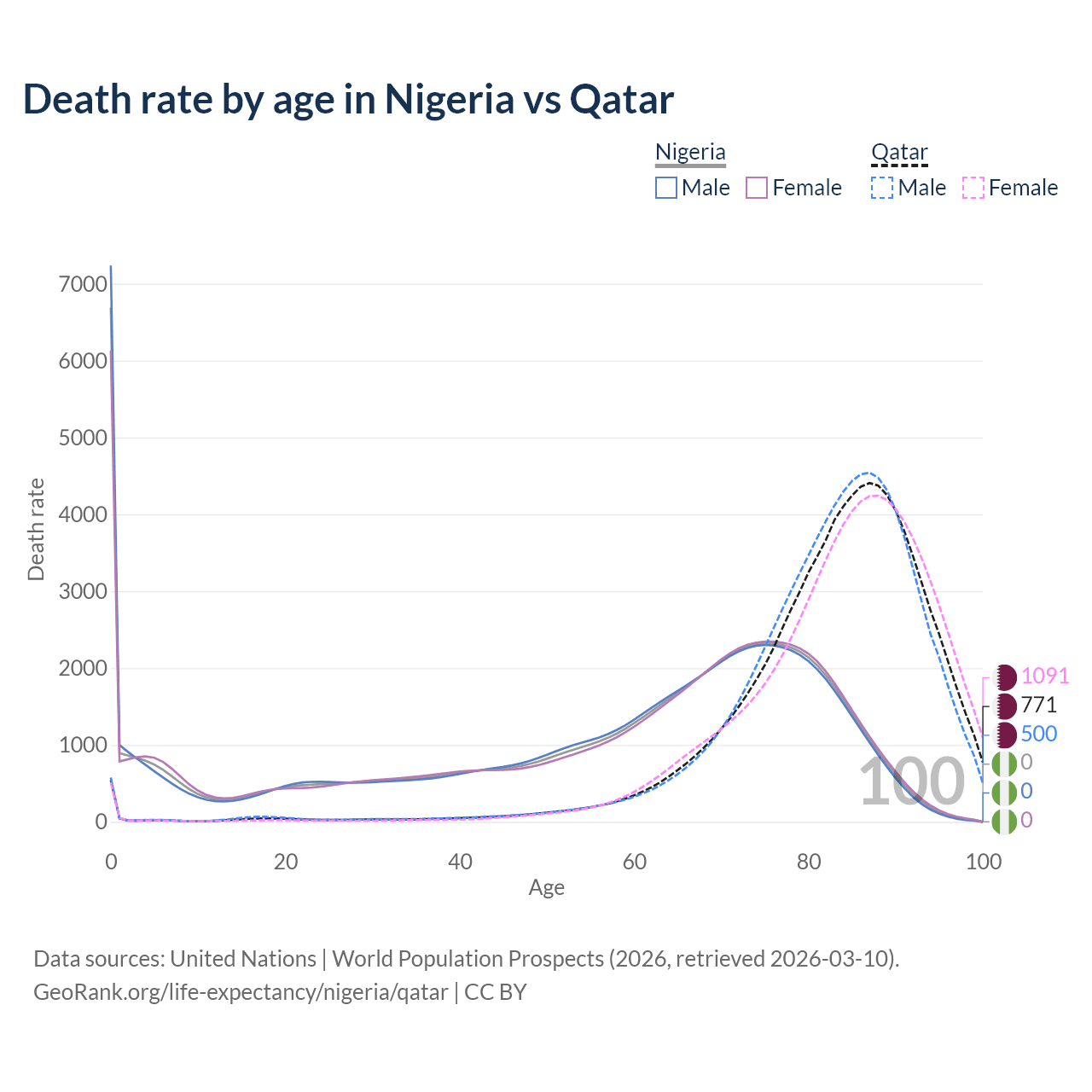 In Nigeria, the most common age of death is 0, compared to 87 in Qatar. The median age of death is 64.3 in Nigeria and 85.1 in Qatar, meaning only half of each cohort is expected to live past that age.