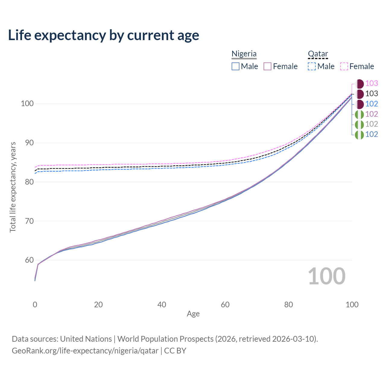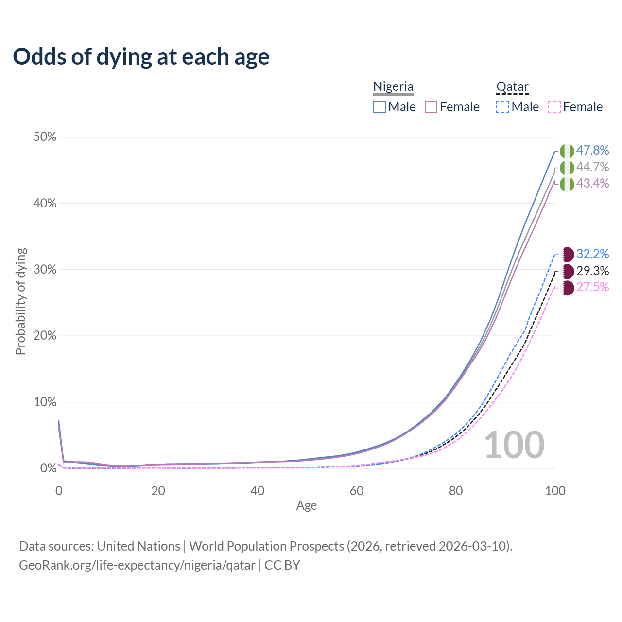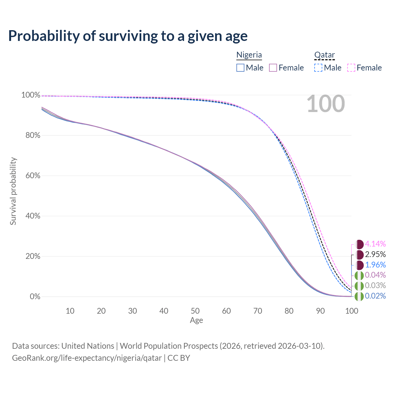 This life expectancy calculator shows the odds of living to 100, 95, 90, and below based on current age for both males and females in Nigeria and Qatar, along with mean and median age of death. The calculations are based on the 2026 life tables (actuarial tables) from the UN World Population Prospects.