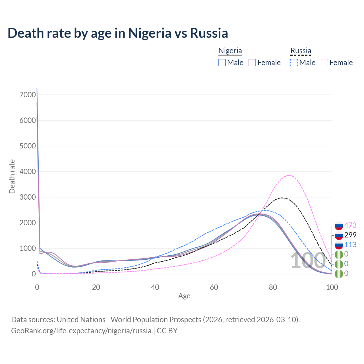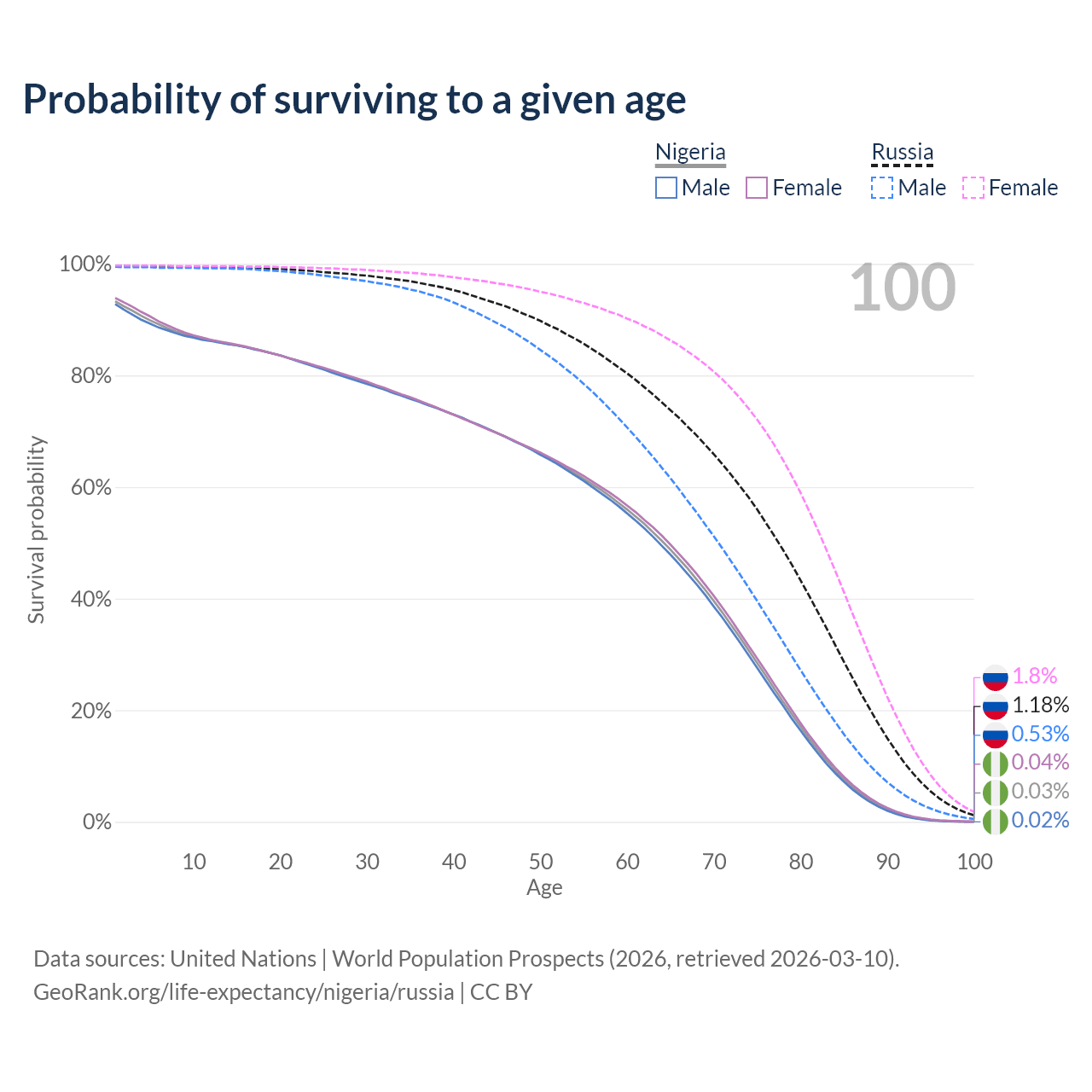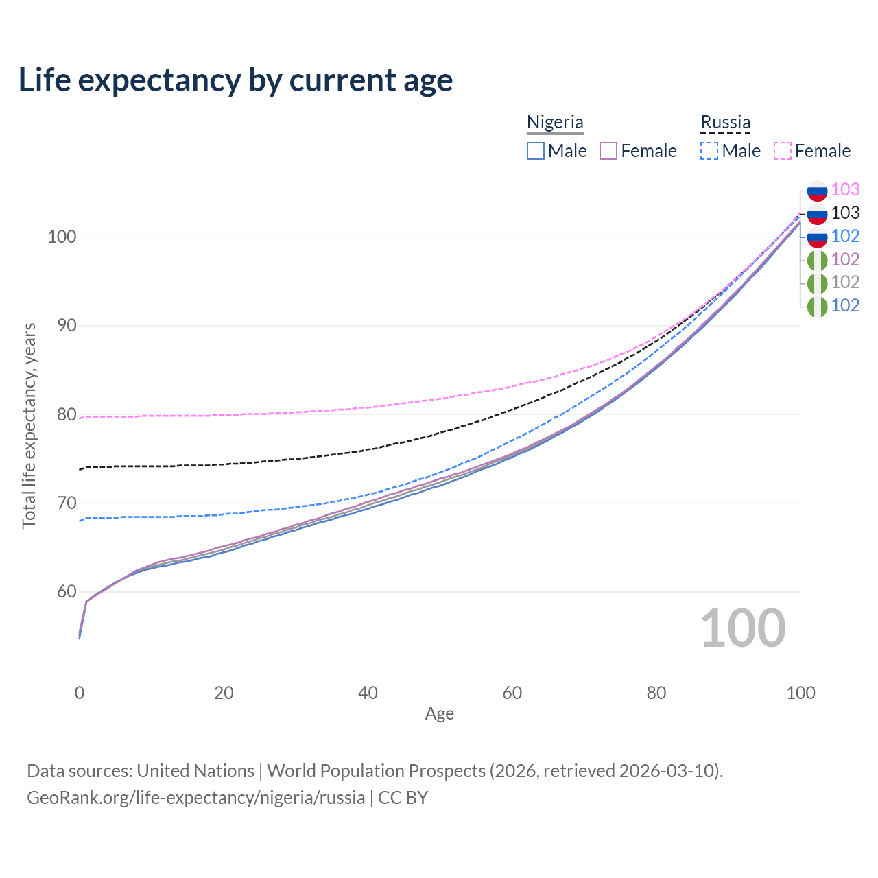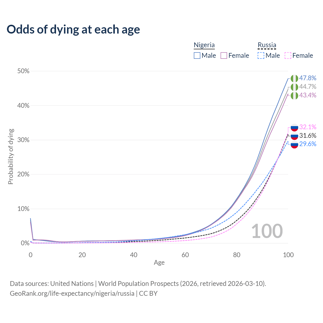 This life expectancy calculator shows the odds of living to 100, 95, 90, and below based on current age for both males and females in Nigeria and Russia, along with mean and median age of death. The calculations are based on the 2026 life tables (actuarial tables) from the UN World Population Prospects.