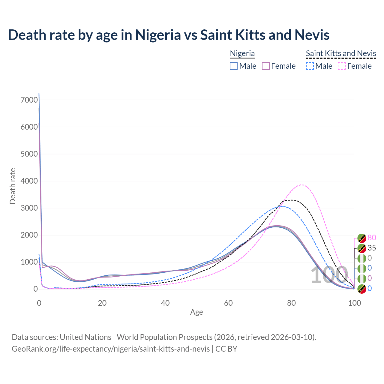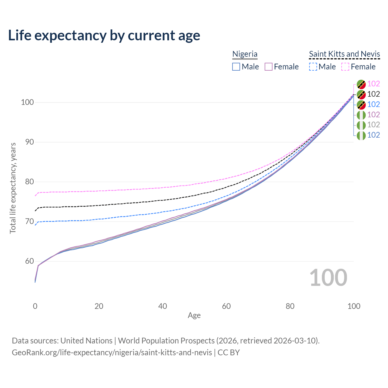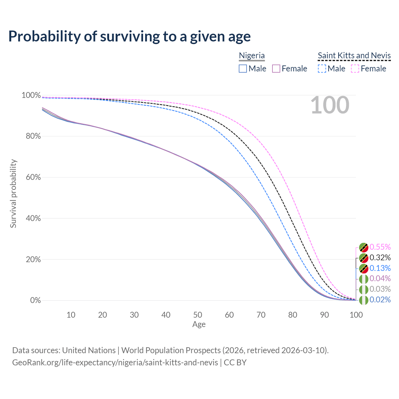 This life expectancy calculator shows the odds of living to 100, 95, 90, and below based on current age for both males and females in Nigeria and Saint Kitts and Nevis, along with mean and median age of death. The calculations are based on the 2026 life tables (actuarial tables) from the UN World Population Prospects.