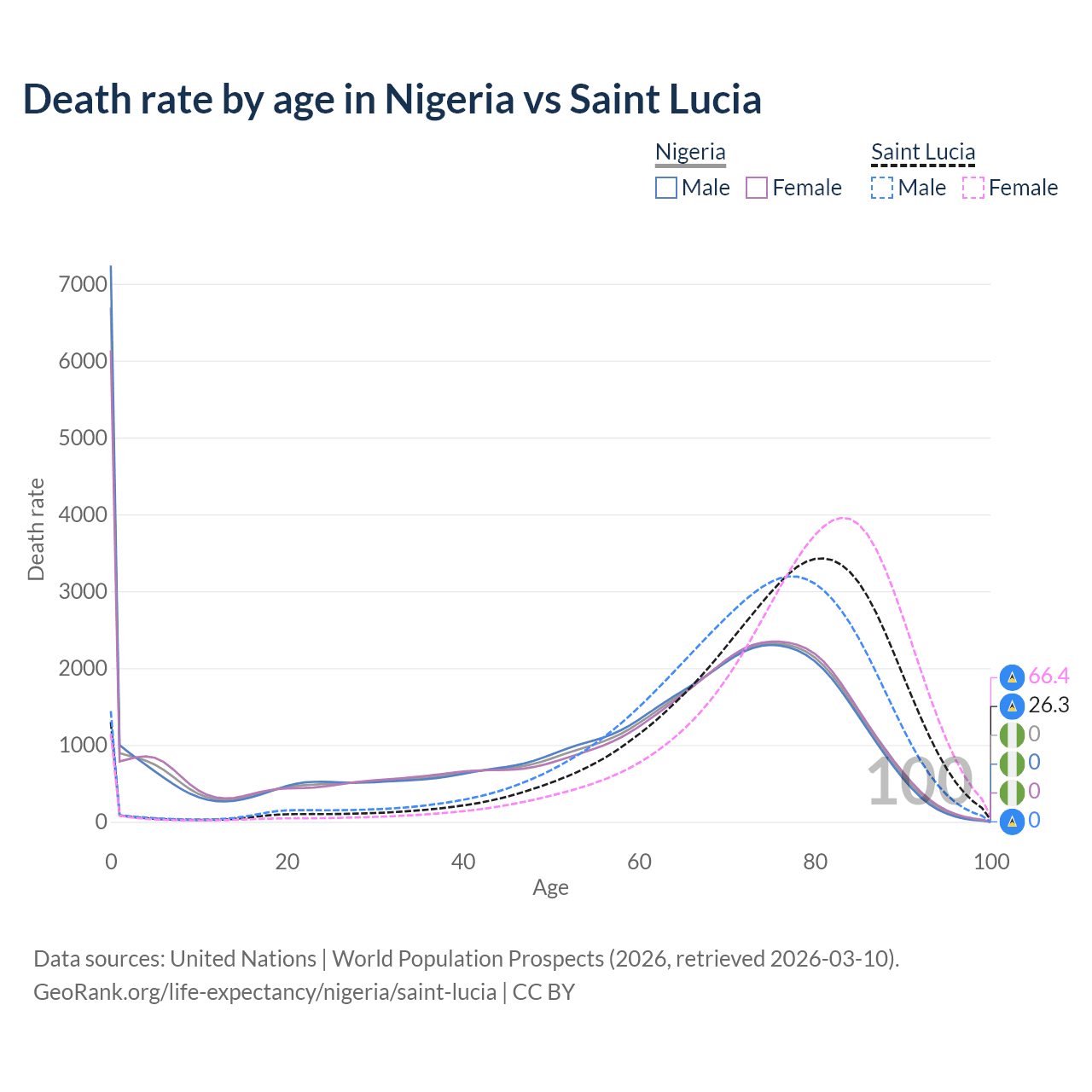 In Nigeria, the most common age of death is 0, compared to 81 in Saint Lucia. The median age of death is 64.3 in Nigeria and 76.8 in Saint Lucia, meaning only half of each cohort is expected to live past that age.