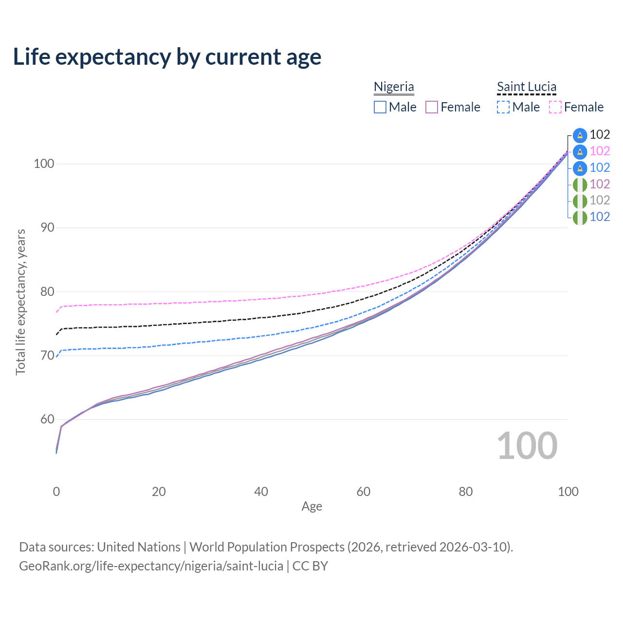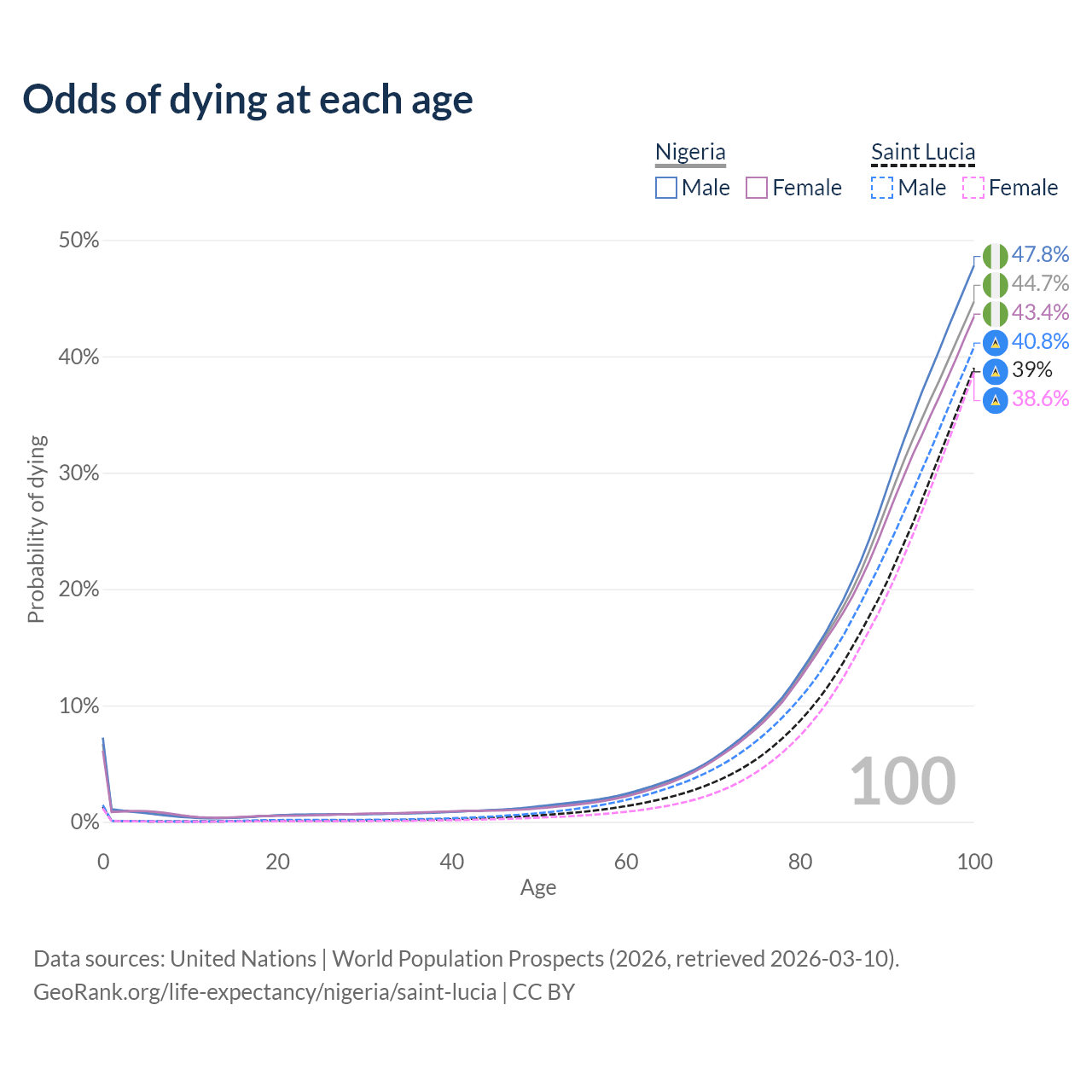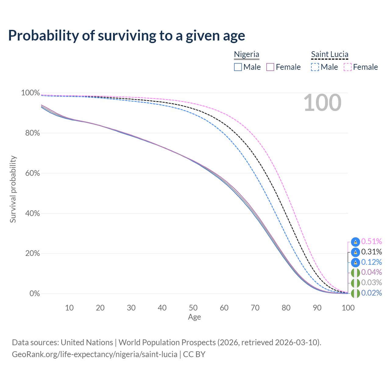 This life expectancy calculator shows the odds of living to 100, 95, 90, and below based on current age for both males and females in Nigeria and Saint Lucia, along with mean and median age of death. The calculations are based on the 2026 life tables (actuarial tables) from the UN World Population Prospects.