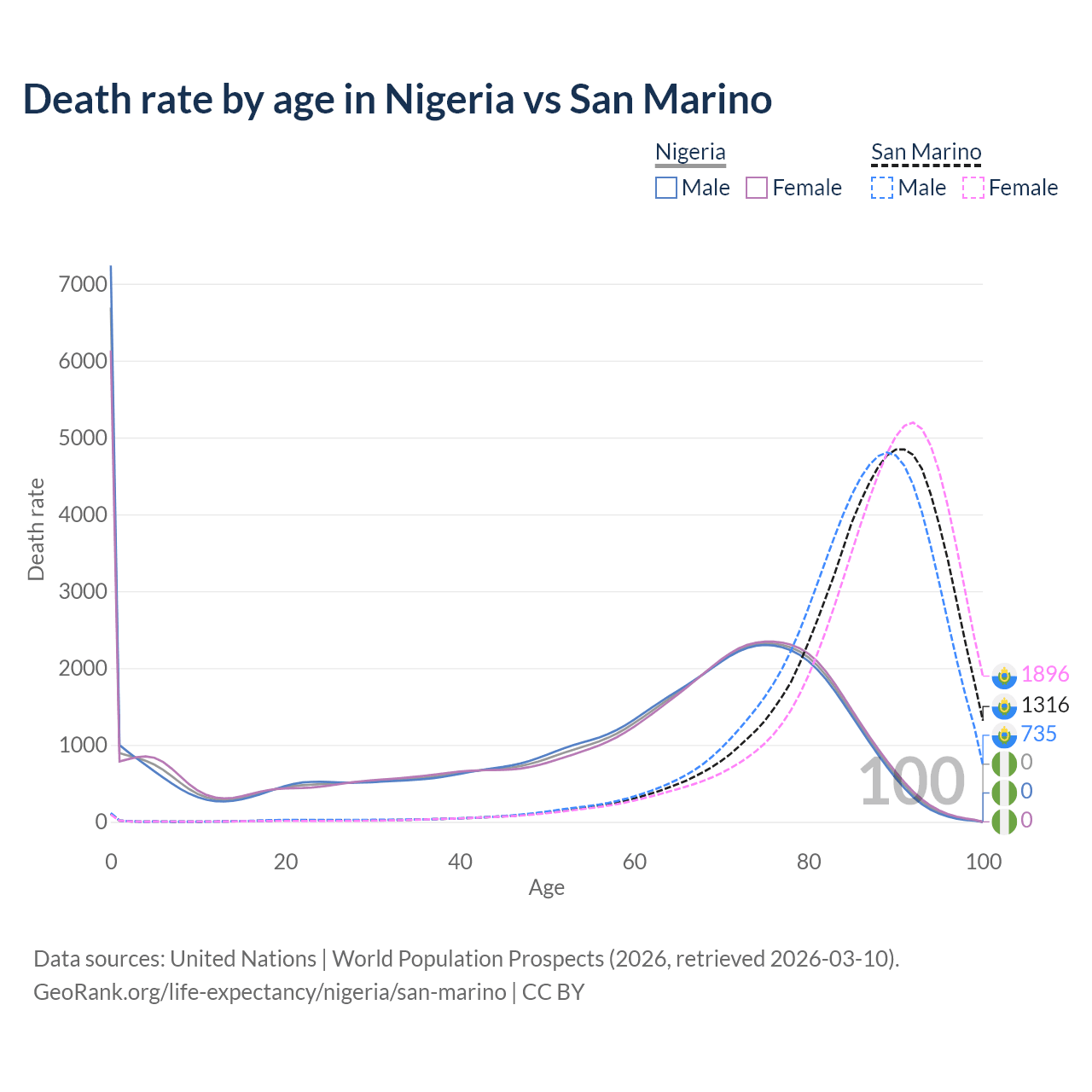 In Nigeria, the most common age of death is 0, compared to 91 in San Marino. The median age of death is 64.3 in Nigeria and 88.3 in San Marino, meaning only half of each cohort is expected to live past that age.