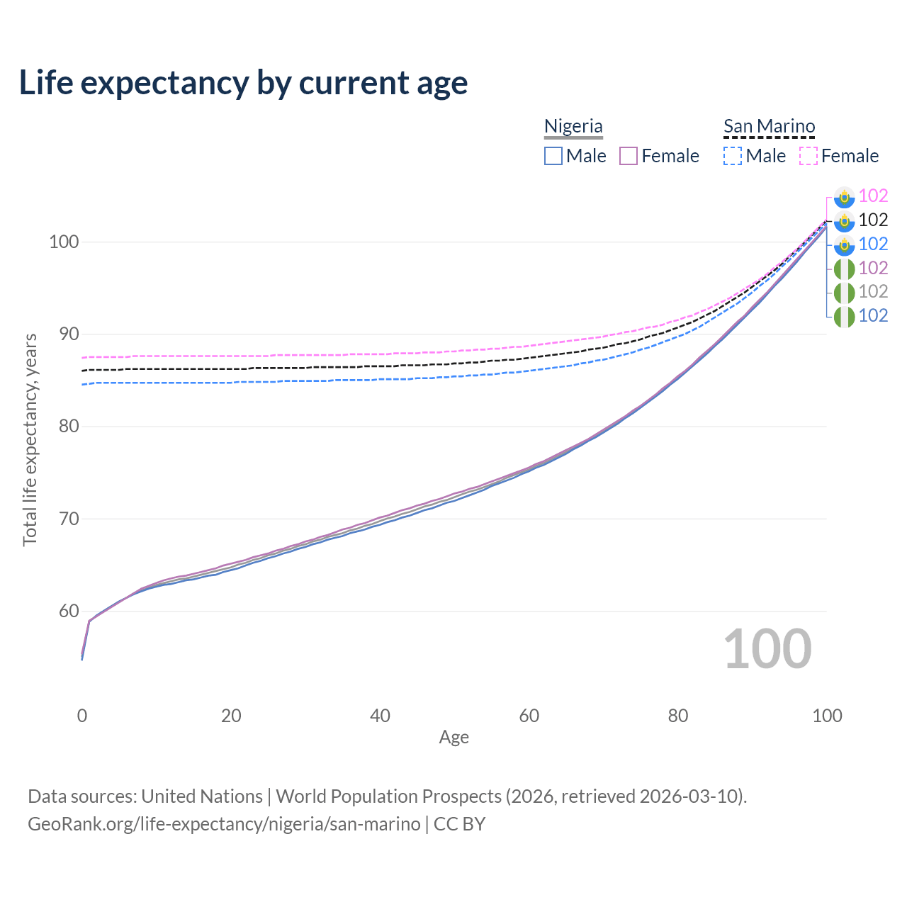 The average life expectancy at birth is 55 years in Nigeria vs 86 in San Marino. Nigeria is ranked 197/197 by life expectancy, and San Marino is 2/197. In Nigeria, the life expectancy is 54.6 years for males and 55.3 years for females. In San Marino, it's 84.5 years for males and 87.4 years for females.