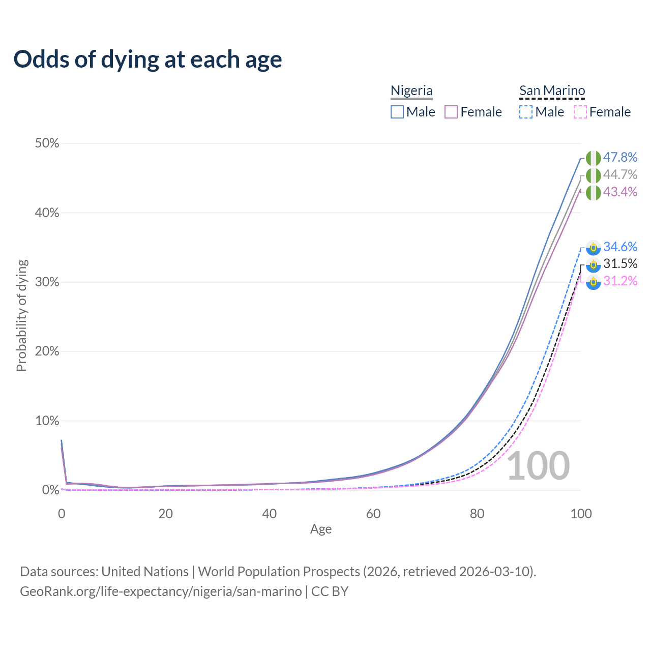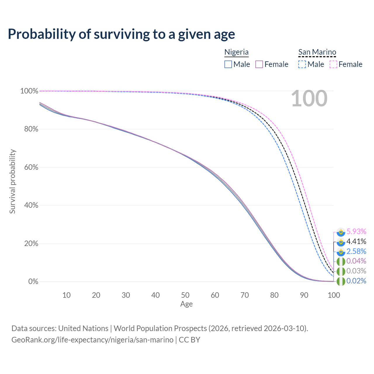 This life expectancy calculator shows the odds of living to 100, 95, 90, and below based on current age for both males and females in Nigeria and San Marino, along with mean and median age of death. The calculations are based on the 2026 life tables (actuarial tables) from the UN World Population Prospects.
