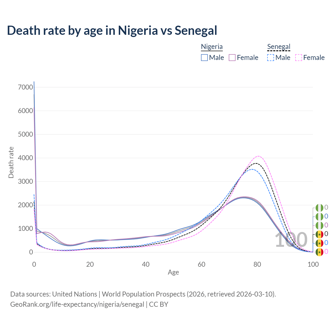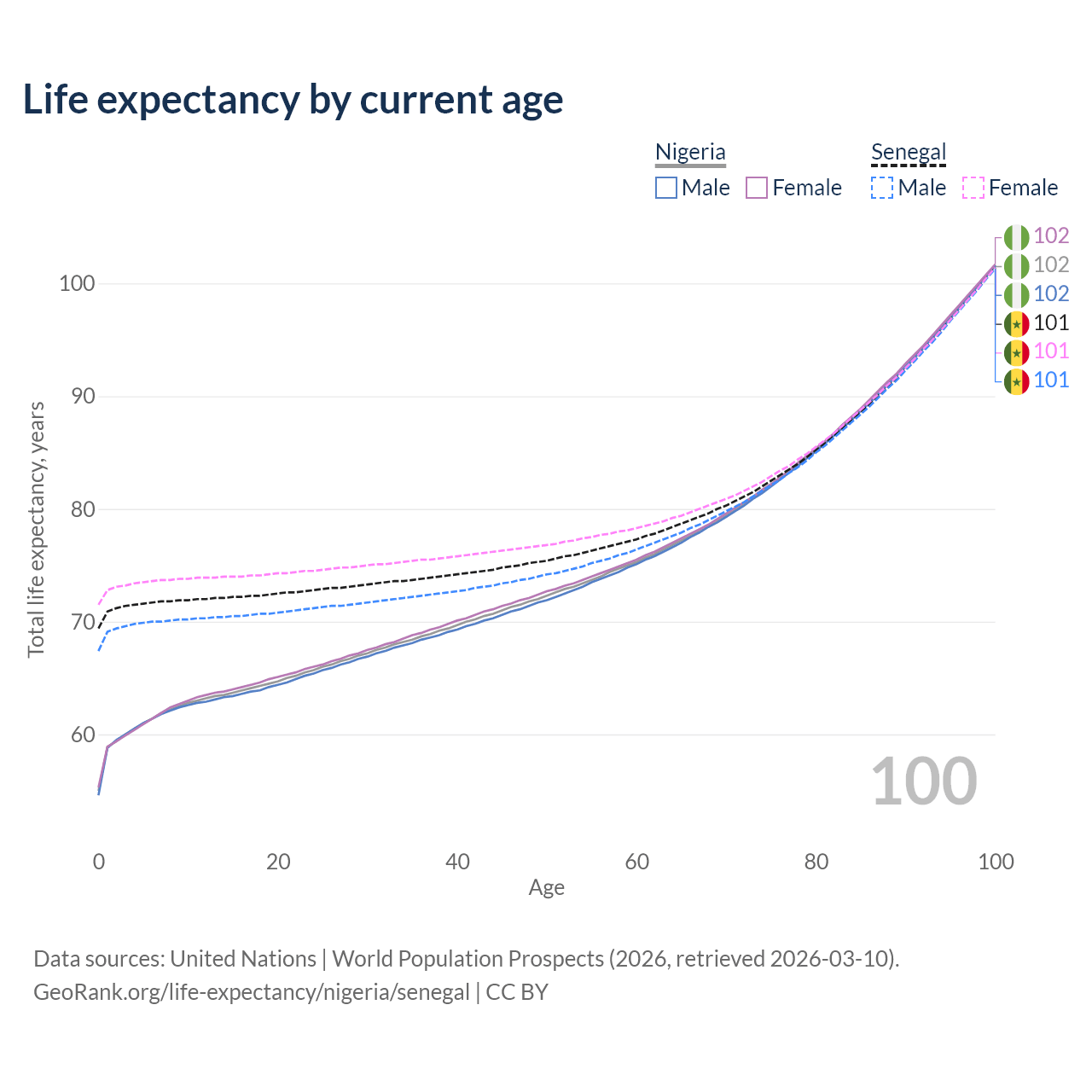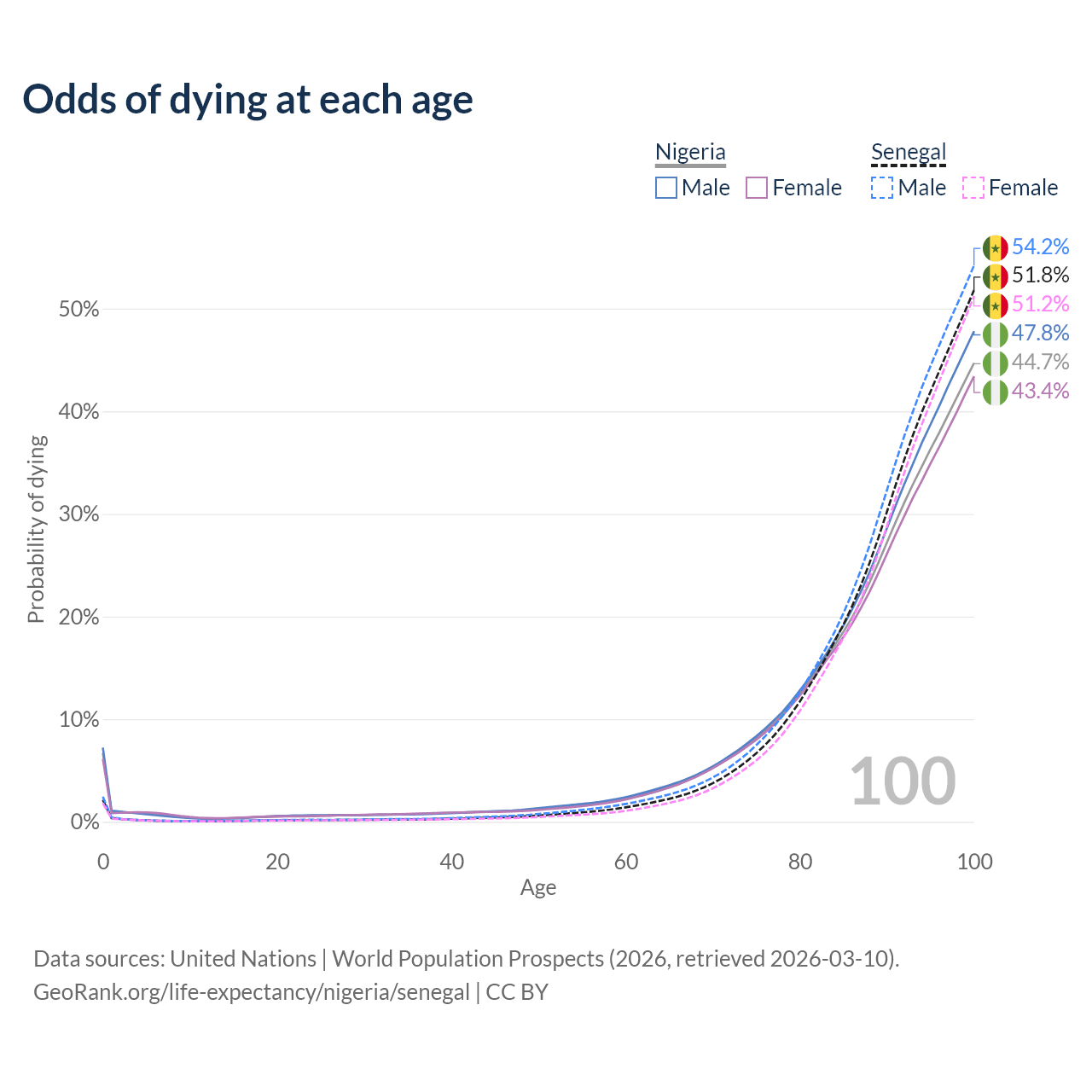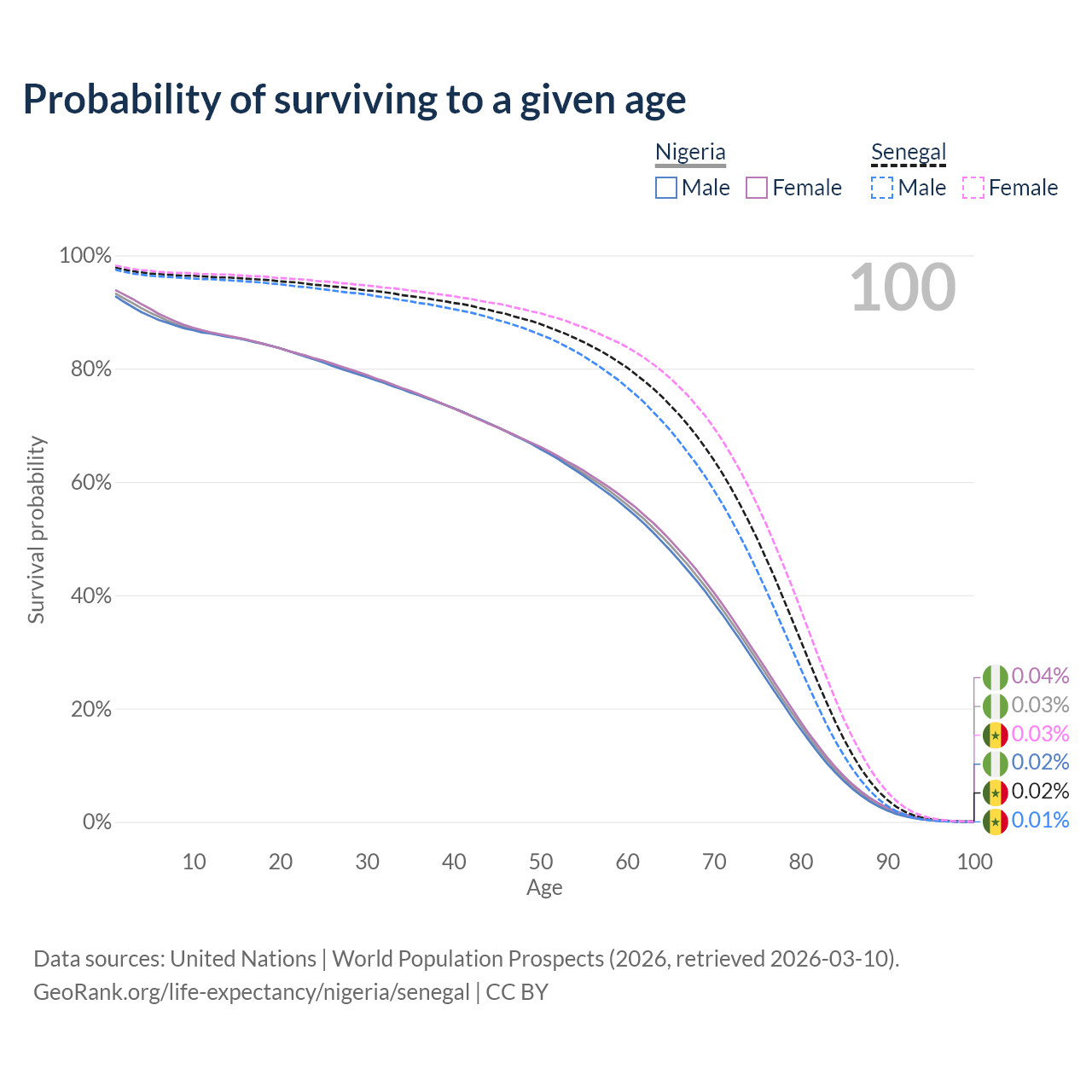 This life expectancy calculator shows the odds of living to 100, 95, 90, and below based on current age for both males and females in Nigeria and Senegal, along with mean and median age of death. The calculations are based on the 2026 life tables (actuarial tables) from the UN World Population Prospects.
