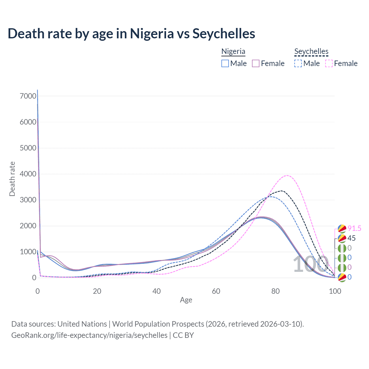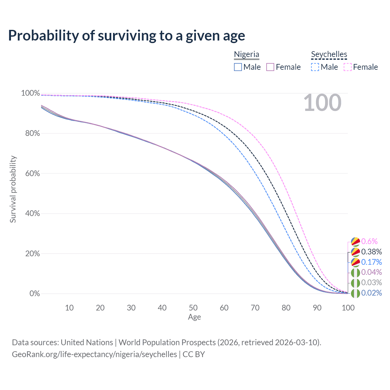 This life expectancy calculator shows the odds of living to 100, 95, 90, and below based on current age for both males and females in Nigeria and the Seychelles, along with mean and median age of death. The calculations are based on the 2026 life tables (actuarial tables) from the UN World Population Prospects.