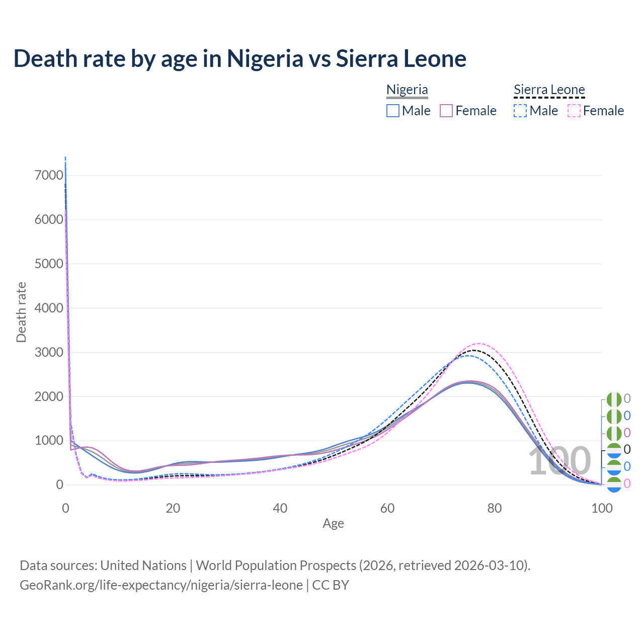 In Nigeria, the most common age of death is 0, compared to 0 in Sierra Leone. The median age of death is 64.3 in Nigeria and 70.8 in Sierra Leone, meaning only half of each cohort is expected to live past that age.