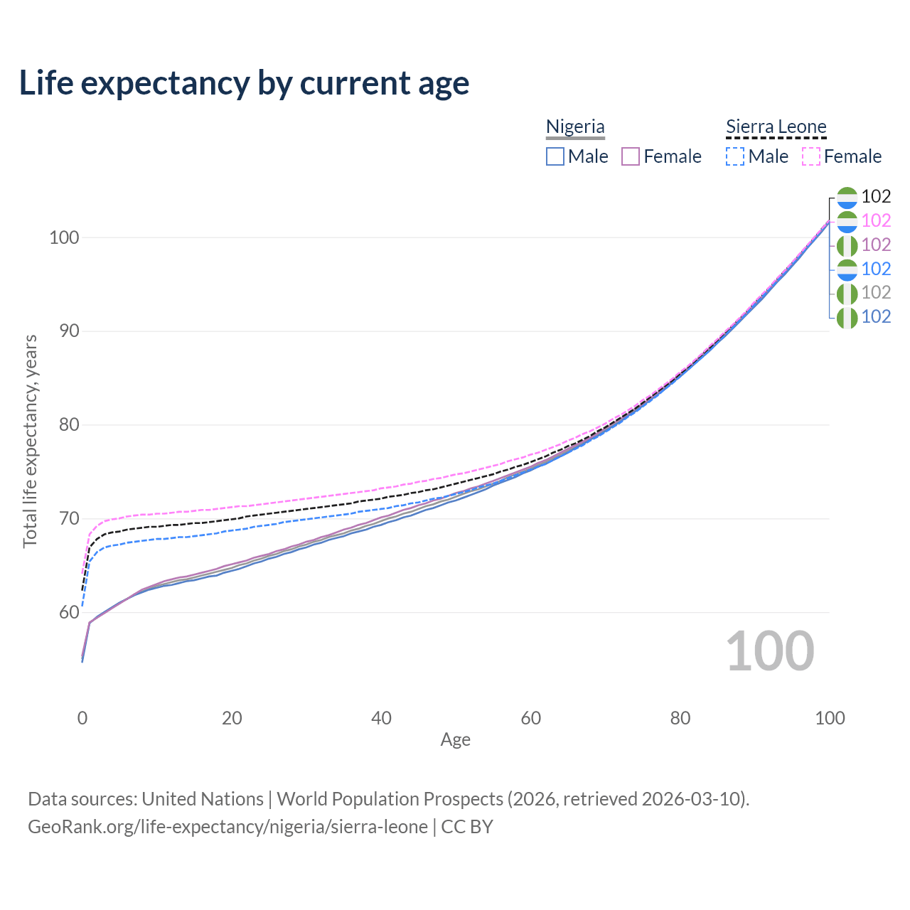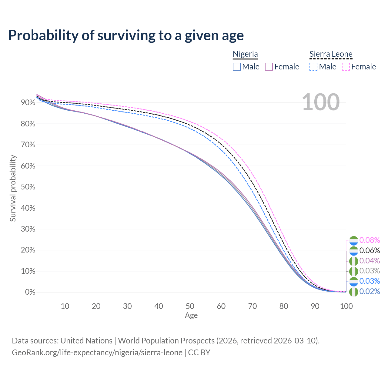 This life expectancy calculator shows the odds of living to 100, 95, 90, and below based on current age for both males and females in Nigeria and Sierra Leone, along with mean and median age of death. The calculations are based on the 2026 life tables (actuarial tables) from the UN World Population Prospects.