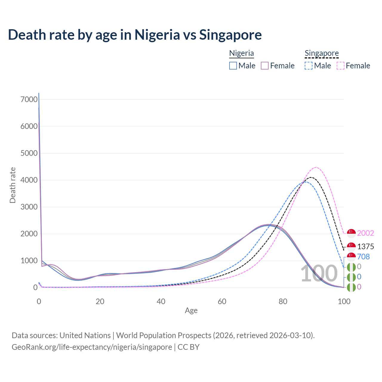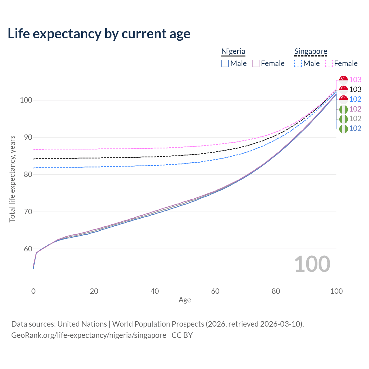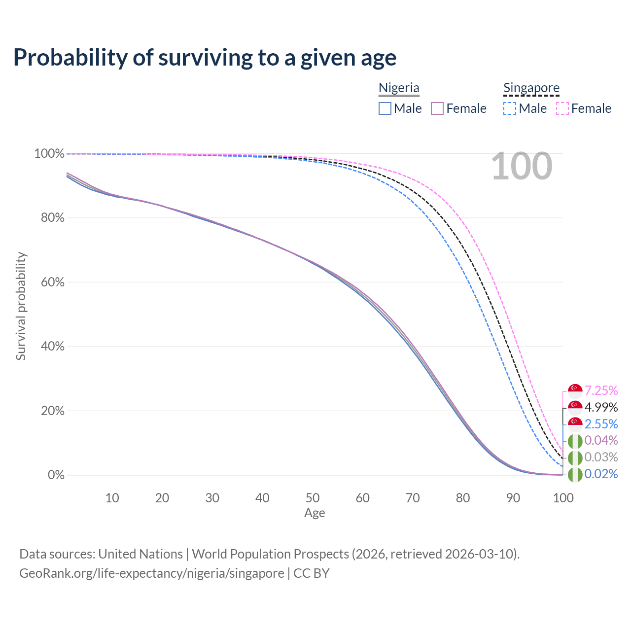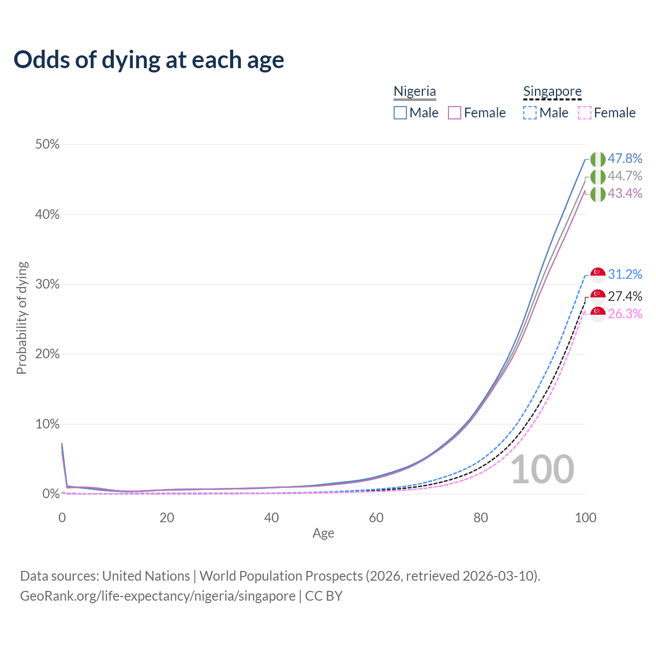 This life expectancy calculator shows the odds of living to 100, 95, 90, and below based on current age for both males and females in Nigeria and Singapore, along with mean and median age of death. The calculations are based on the 2026 life tables (actuarial tables) from the UN World Population Prospects.