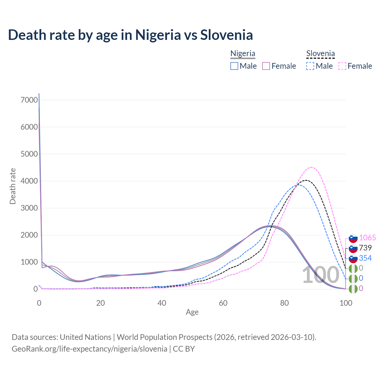 In Nigeria, the most common age of death is 0, compared to 87 in Slovenia. The median age of death is 64.3 in Nigeria and 84.4 in Slovenia, meaning only half of each cohort is expected to live past that age.