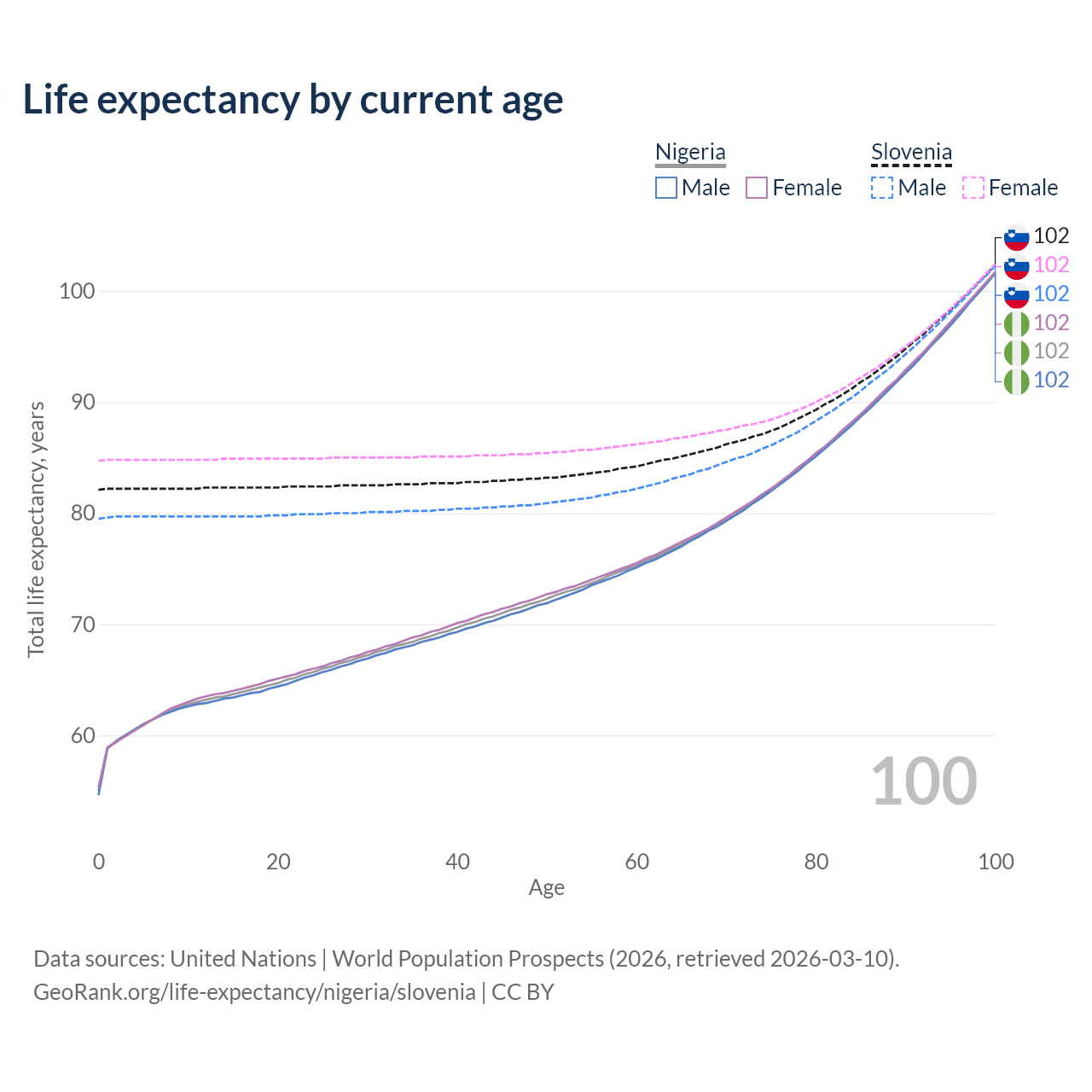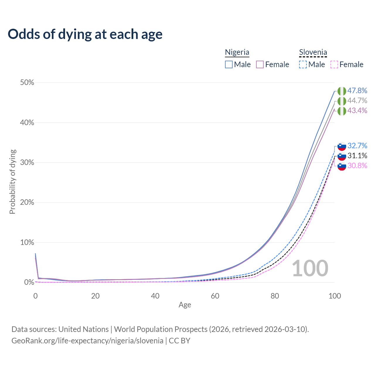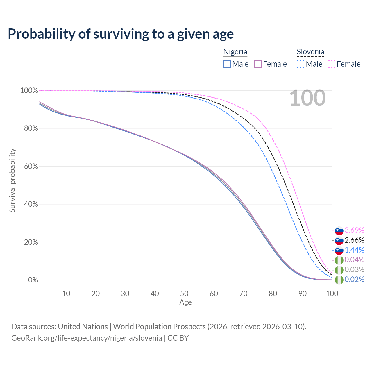 This life expectancy calculator shows the odds of living to 100, 95, 90, and below based on current age for both males and females in Nigeria and Slovenia, along with mean and median age of death. The calculations are based on the 2026 life tables (actuarial tables) from the UN World Population Prospects.