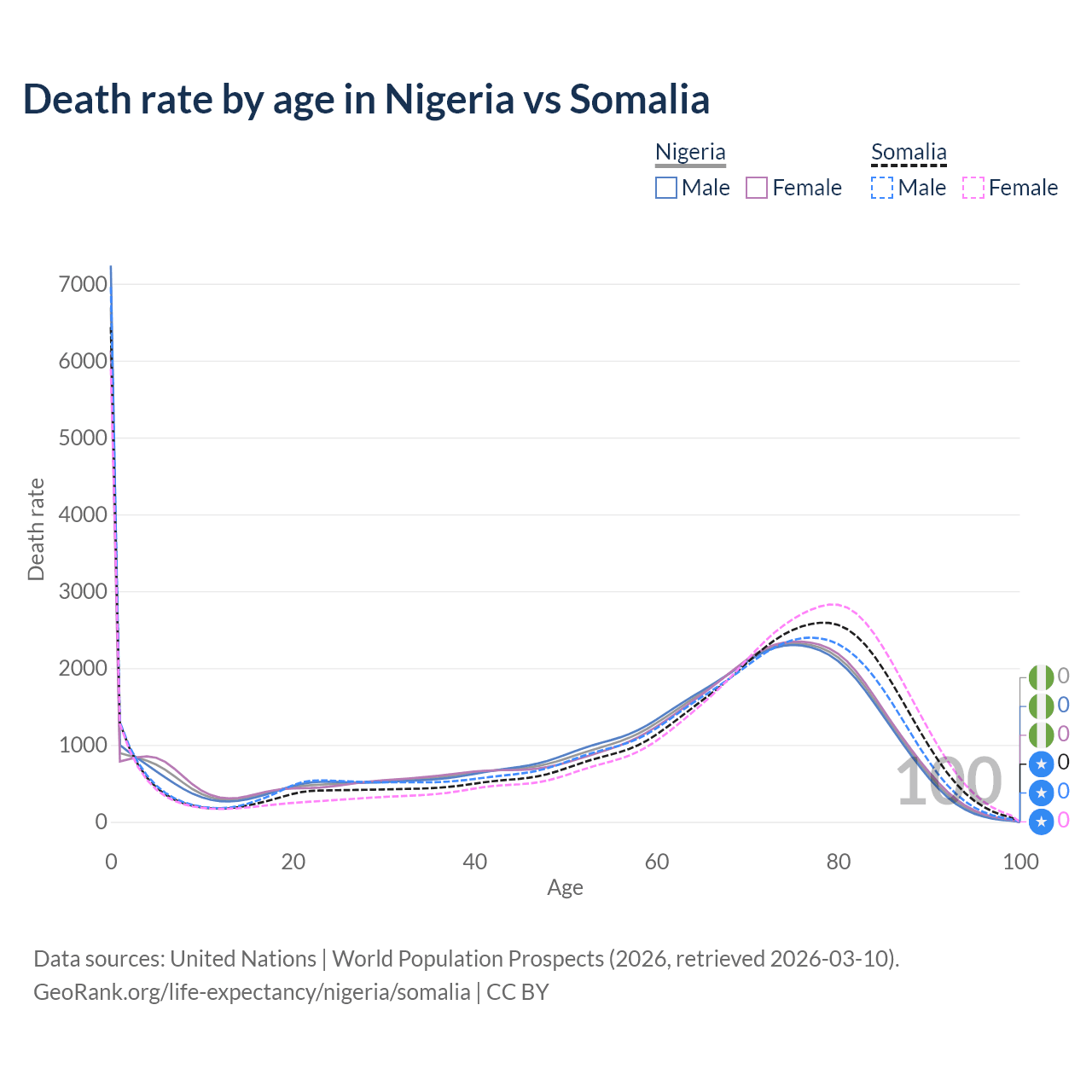 In Nigeria, the most common age of death is 0, compared to 0 in Somalia. The median age of death is 64.3 in Nigeria and 69 in Somalia, meaning only half of each cohort is expected to live past that age.