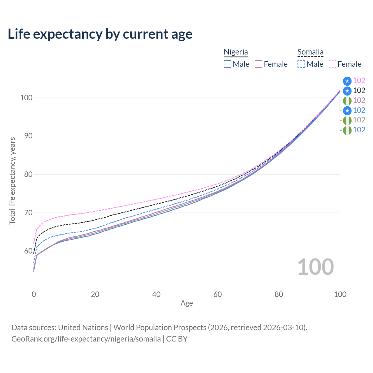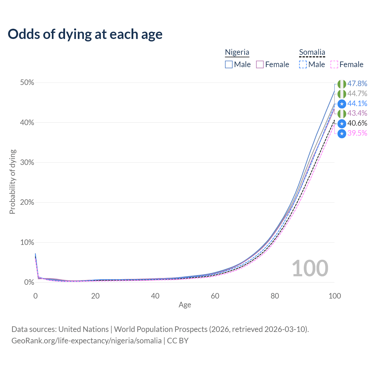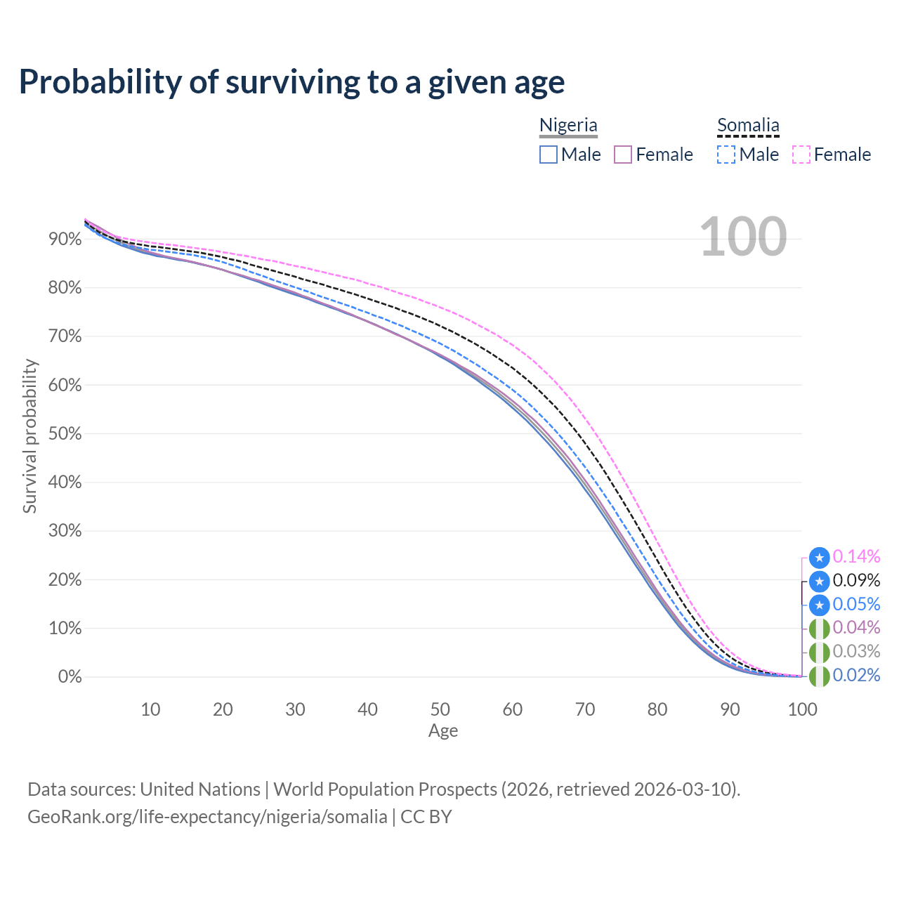 This life expectancy calculator shows the odds of living to 100, 95, 90, and below based on current age for both males and females in Nigeria and Somalia, along with mean and median age of death. The calculations are based on the 2026 life tables (actuarial tables) from the UN World Population Prospects.