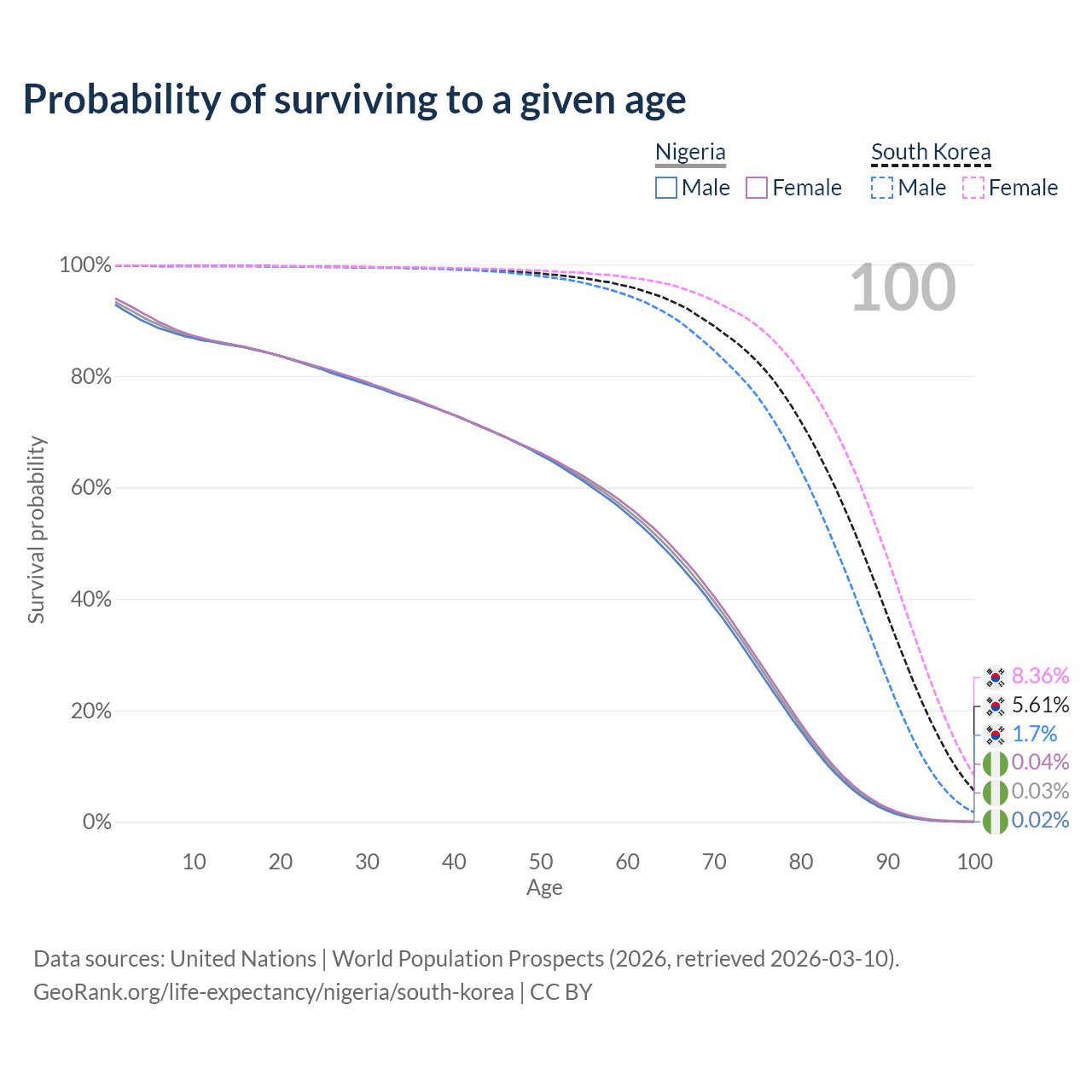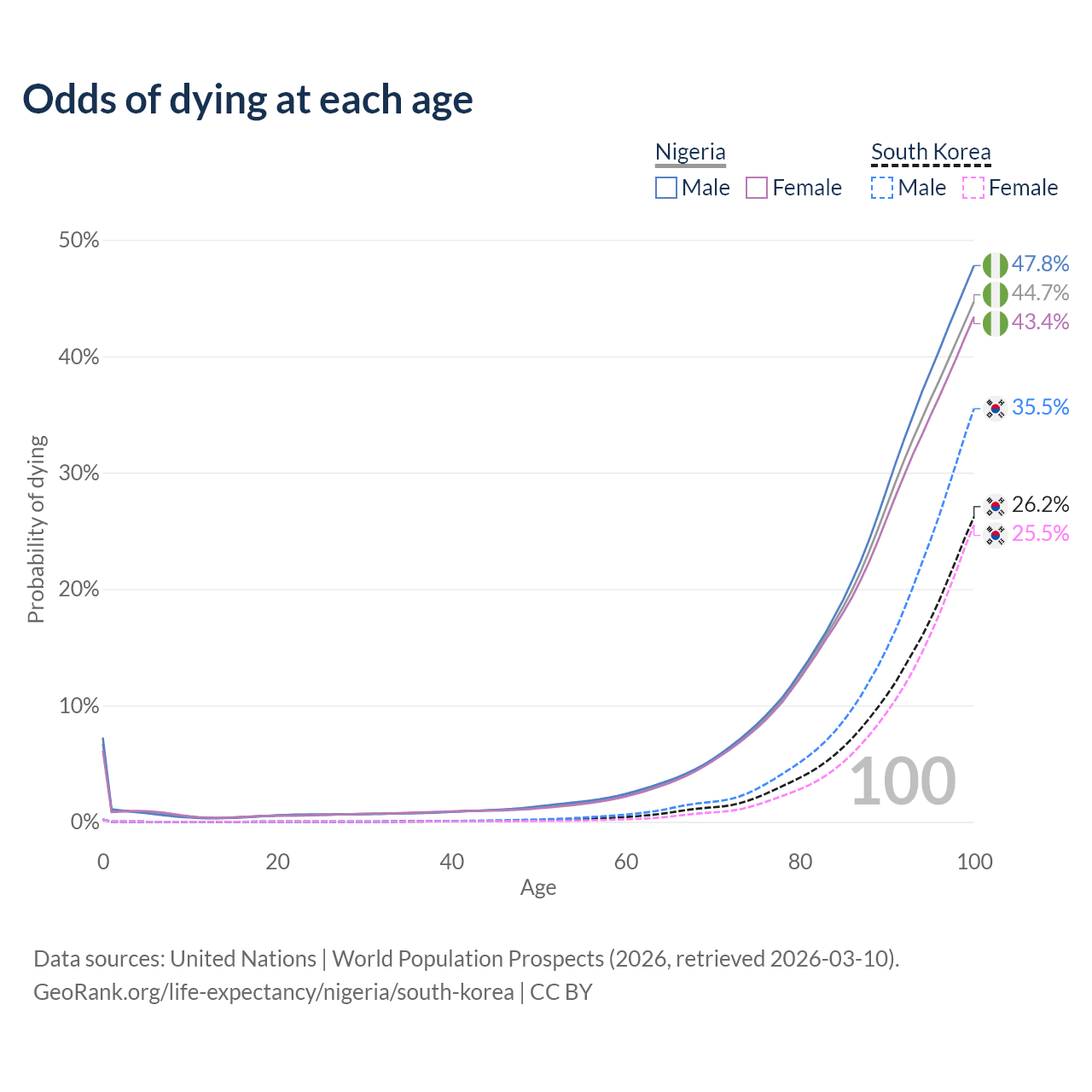 This life expectancy calculator shows the odds of living to 100, 95, 90, and below based on current age for both males and females in Nigeria and South Korea, along with mean and median age of death. The calculations are based on the 2026 life tables (actuarial tables) from the UN World Population Prospects.