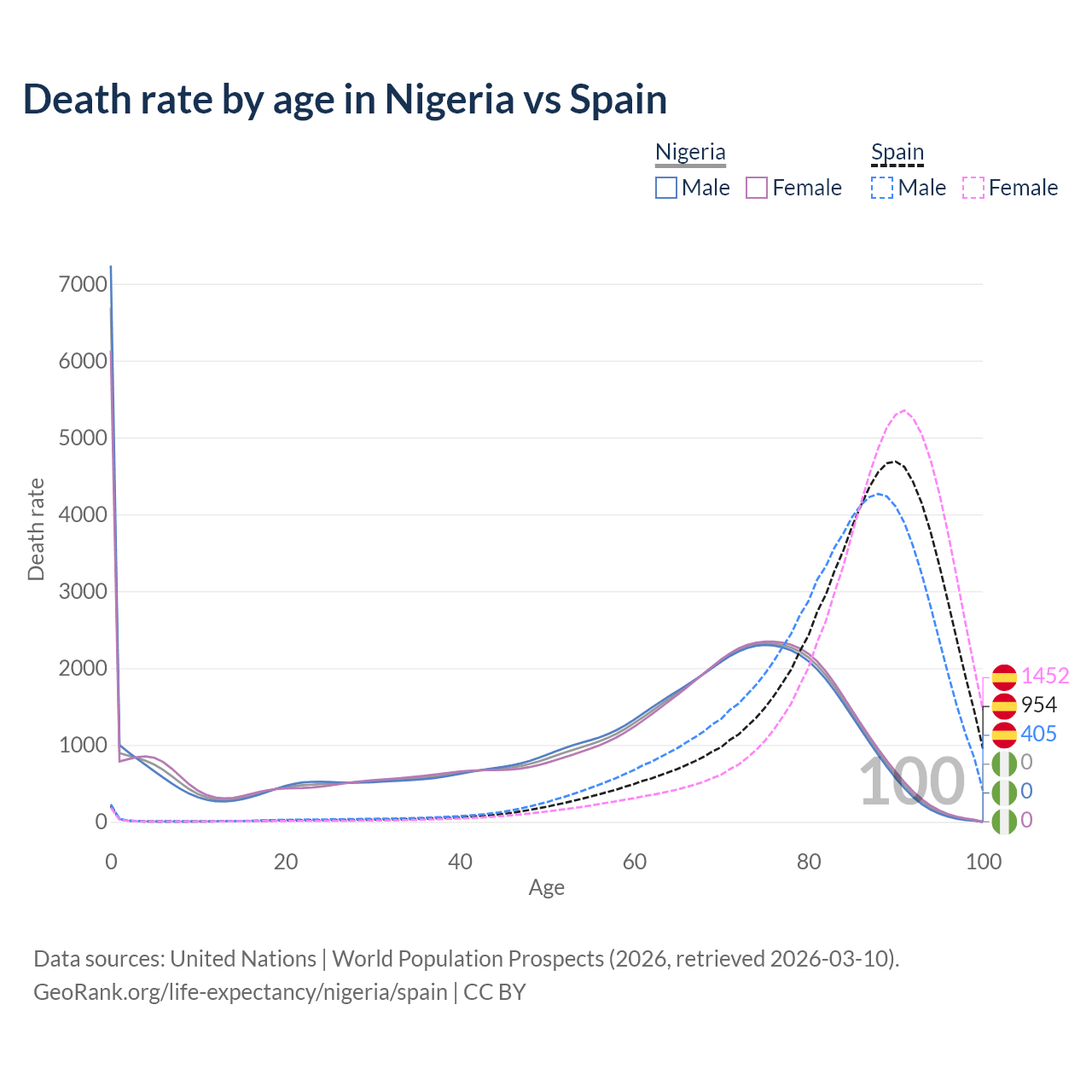 In Nigeria, the most common age of death is 0, compared to 90 in Spain. The median age of death is 64.3 in Nigeria and 87 in Spain, meaning only half of each cohort is expected to live past that age.
