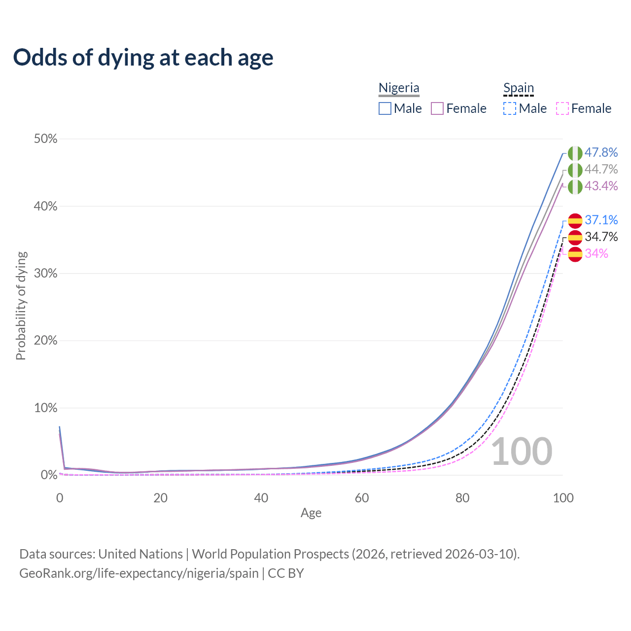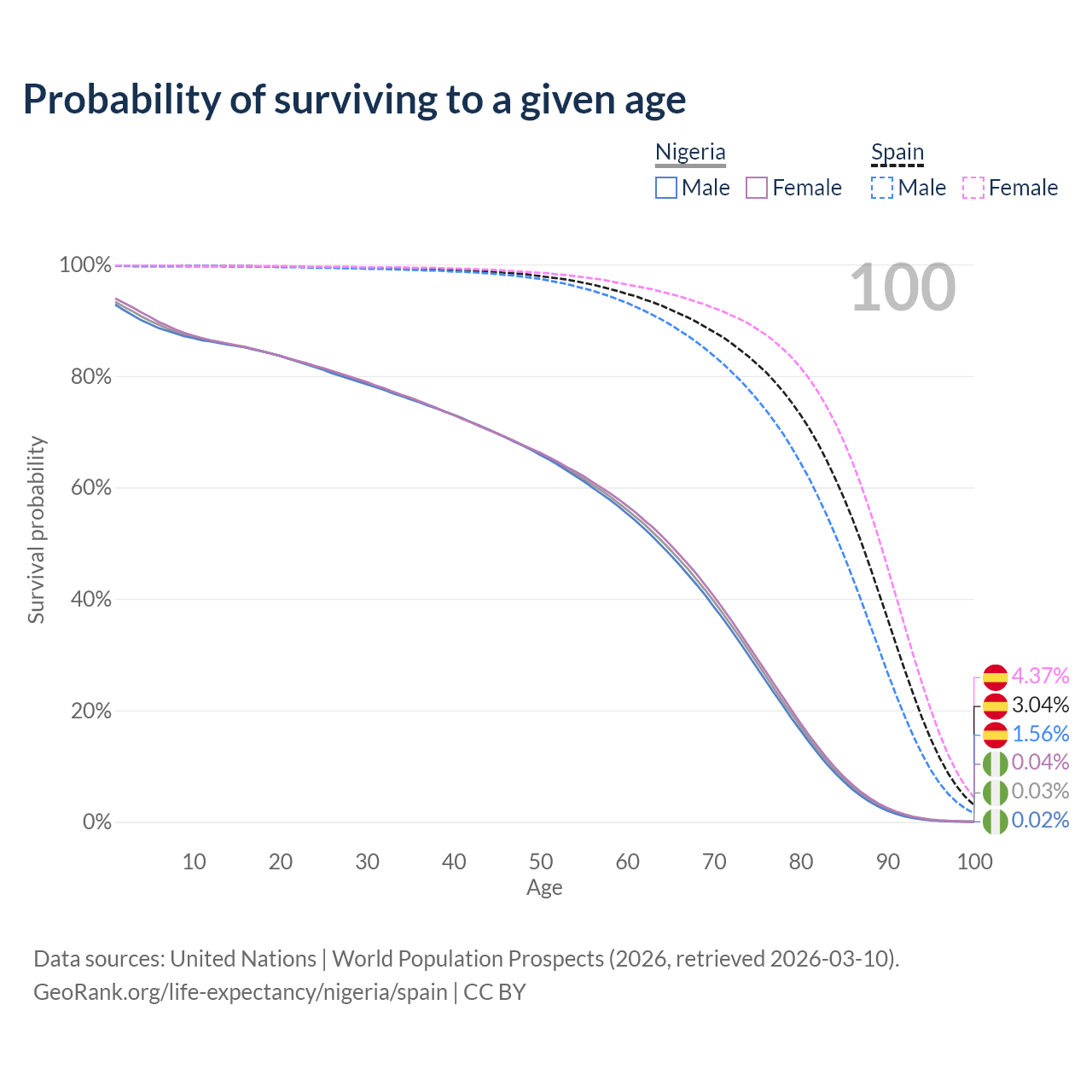 This life expectancy calculator shows the odds of living to 100, 95, 90, and below based on current age for both males and females in Nigeria and Spain, along with mean and median age of death. The calculations are based on the 2026 life tables (actuarial tables) from the UN World Population Prospects.