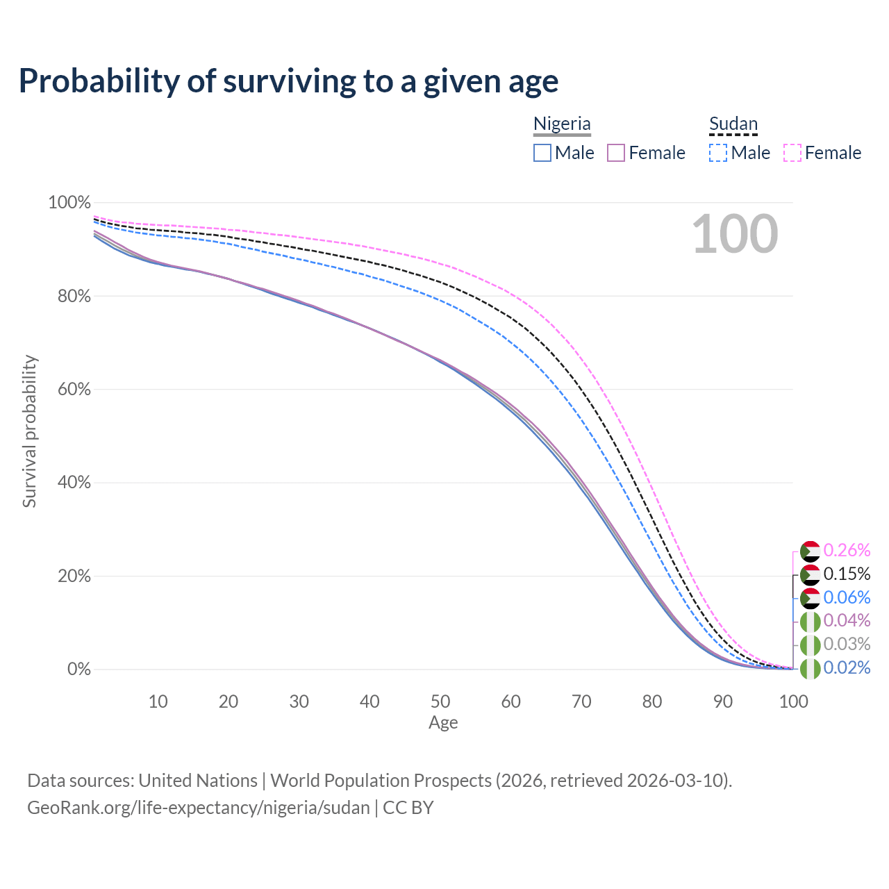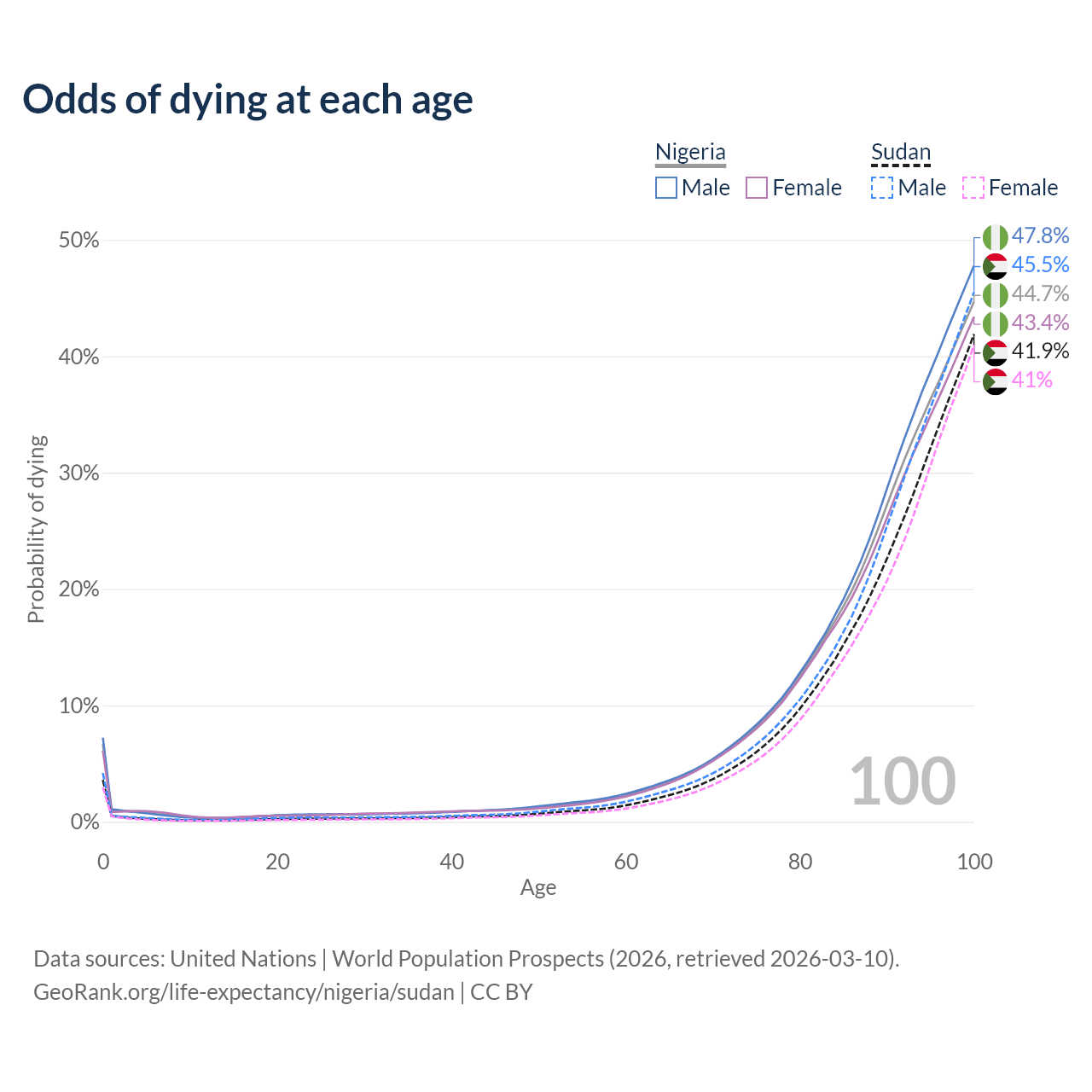 This life expectancy calculator shows the odds of living to 100, 95, 90, and below based on current age for both males and females in Nigeria and Sudan, along with mean and median age of death. The calculations are based on the 2026 life tables (actuarial tables) from the UN World Population Prospects.