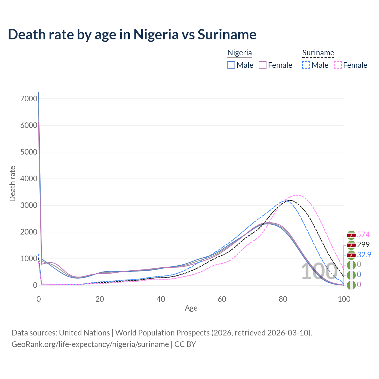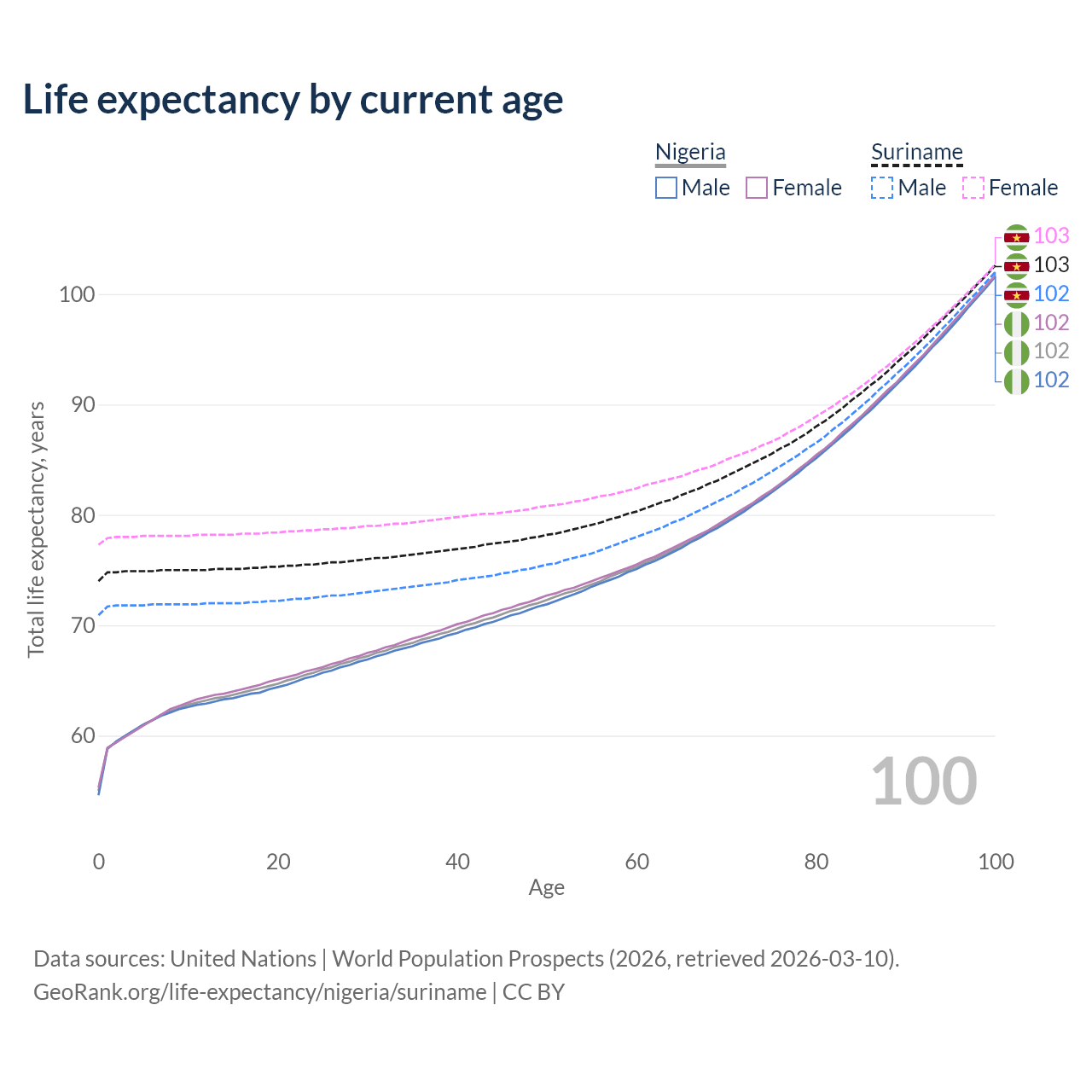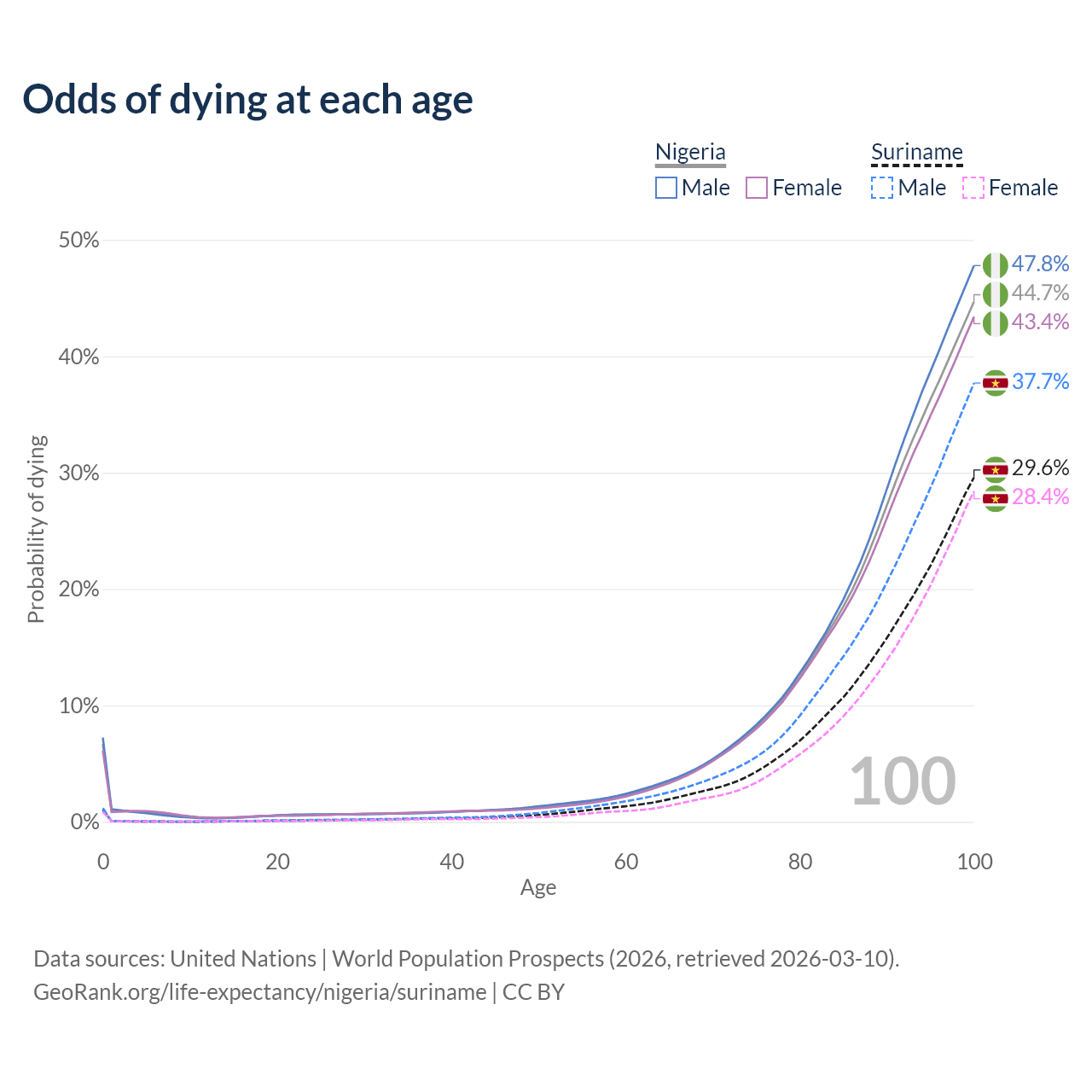 This life expectancy calculator shows the odds of living to 100, 95, 90, and below based on current age for both males and females in Nigeria and Suriname, along with mean and median age of death. The calculations are based on the 2026 life tables (actuarial tables) from the UN World Population Prospects.